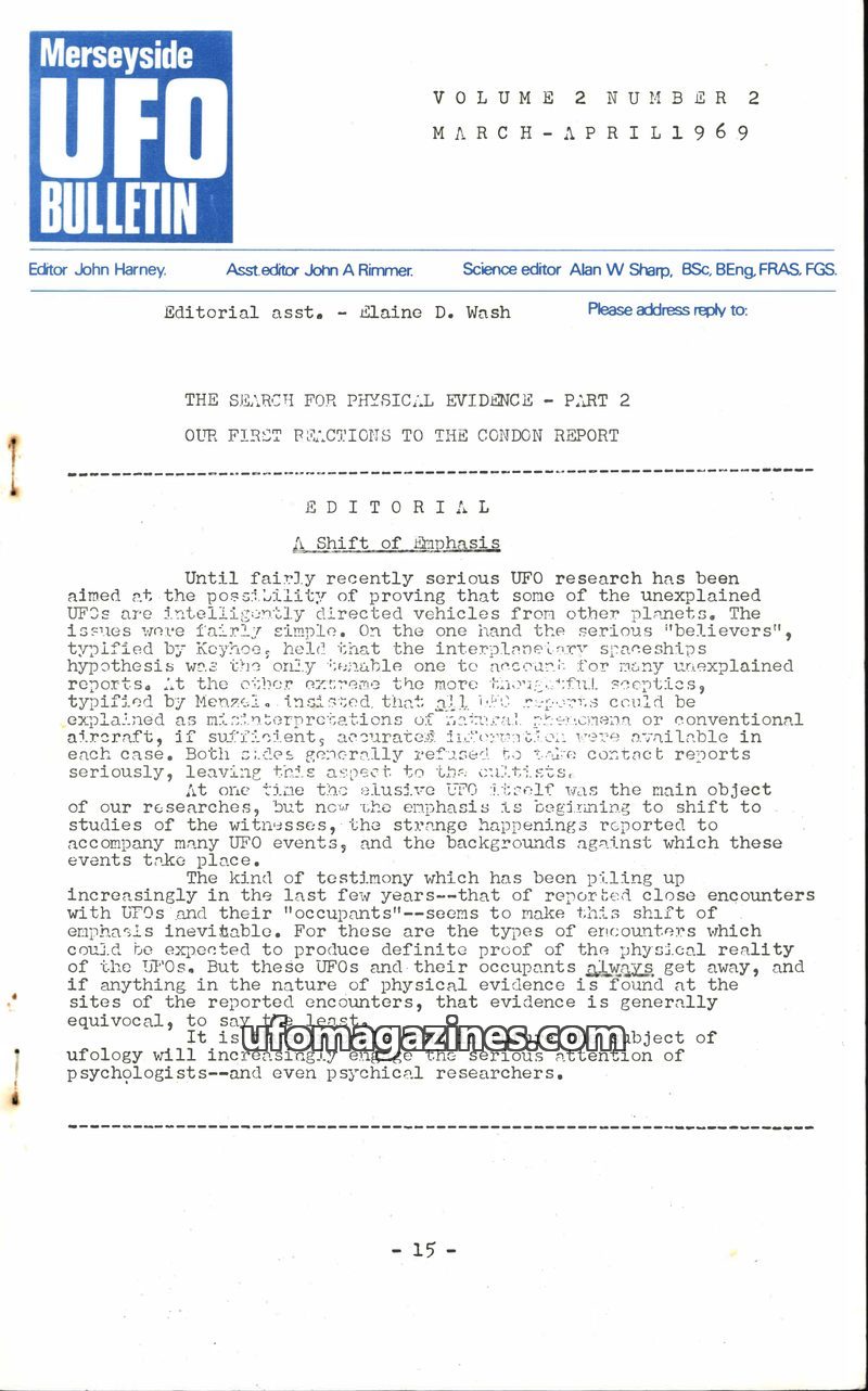 This issue of the Merseyside UFO Bulletin covers the recently published Condon Report, which ufologists predict concludes that UFOs are not alien spacecraft and that extraterrestri