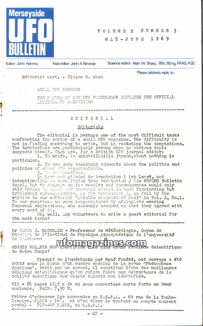 This issue of the Merseyside UFO Bulletin from May-June 1969 delves into the nature of UFO phenomena and the official stance of skepticism. It features an editorial discussing the