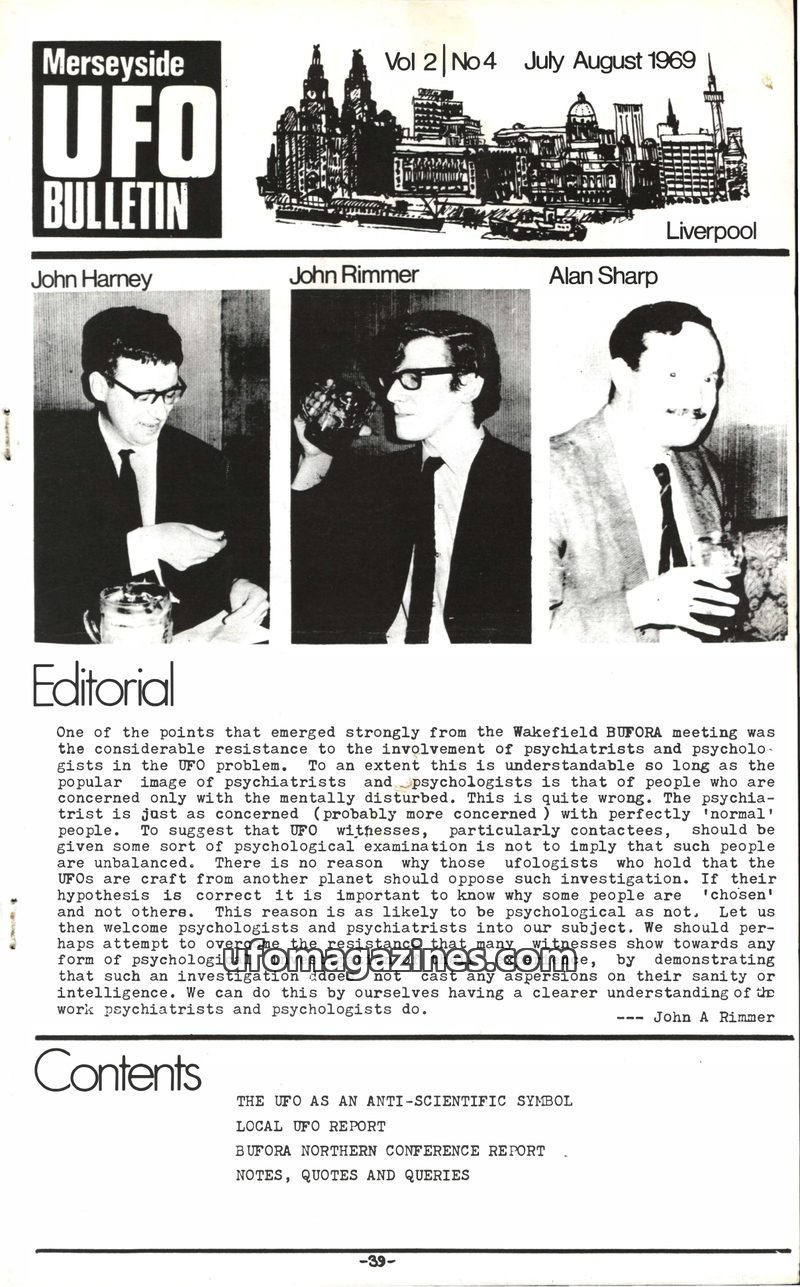 This issue of the Merseyside UFO Bulletin from July-August 1969 discusses the resistance to psychological involvement in UFO investigations and argues for its necessity. It include