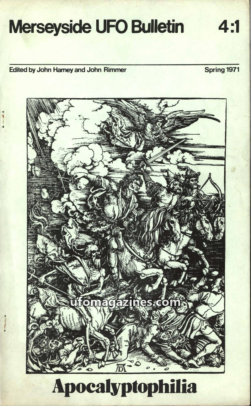 This issue of the Merseyside UFO Bulletin (Vol 4, No 1, Spring 1971) focuses on 'Apocalyptophilia,' exploring the societal desire for apocalyptic events and its connection to UFO p