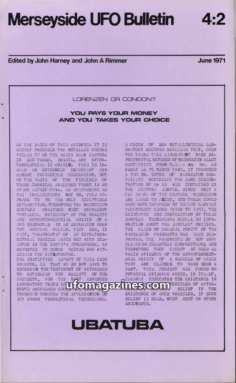 This inaugural issue of the Merseyside UFO Bulletin focuses on the controversial Condon Committee's investigation into UFOs, questioning its motives and methods. It also details th