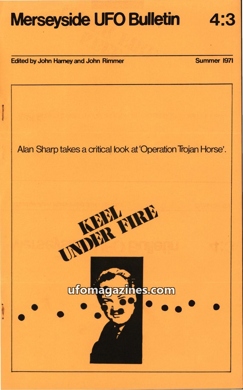 This issue of the Merseyside UFO Bulletin covers a critical review of John Keel's 'Operation Trojan Horse', questioning his research methods and conclusions, particularly regarding