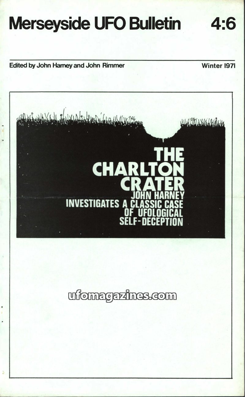 This issue of the Merseyside UFO Bulletin (Vol. 4, No. 6, Winter 1971) focuses on the Charlton Crater incident in Wiltshire, UK, examining it as a case of ufological self-deception