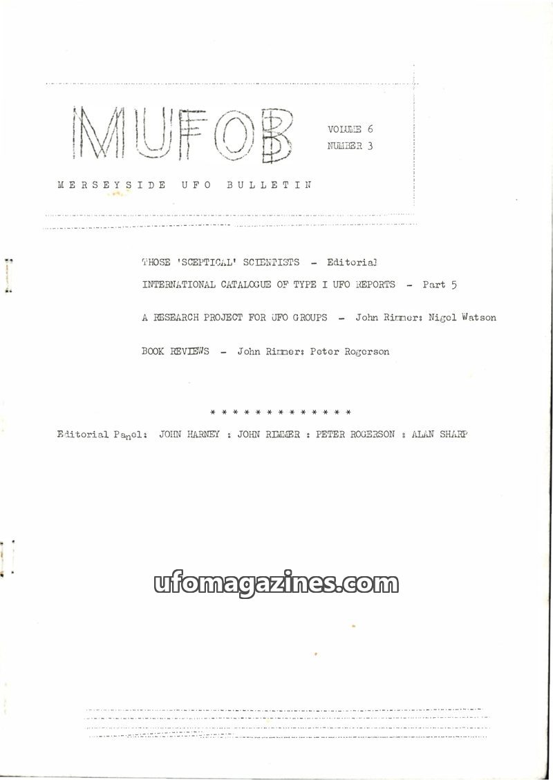 This issue of MUFOB introduces an international catalogue of Type 1 UFO reports, compiled by Peter Rogerson, which aims to expand upon Jacques Vallee's previous work. The catalogue