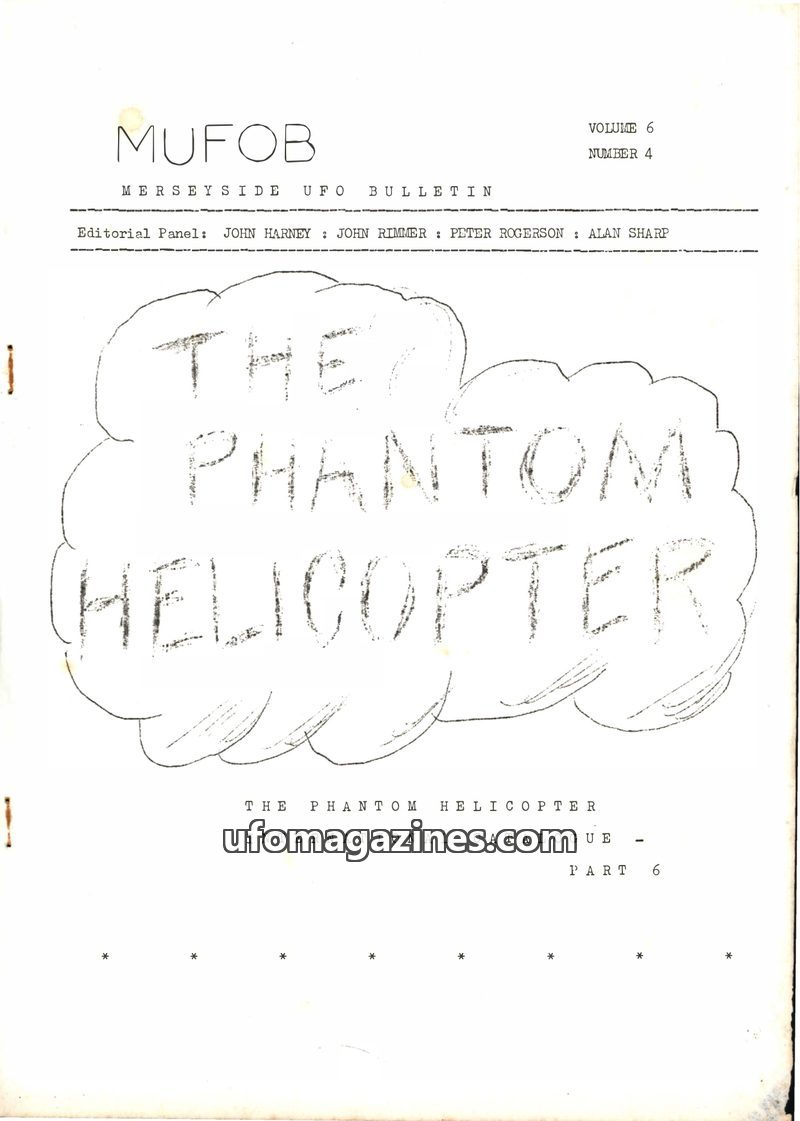 This issue of MUFOB focuses on 'The Phantom Helicopter' phenomenon, which is analyzed as a typical UFO flap with some real helicopter sightings used to confuse the issue. It also p