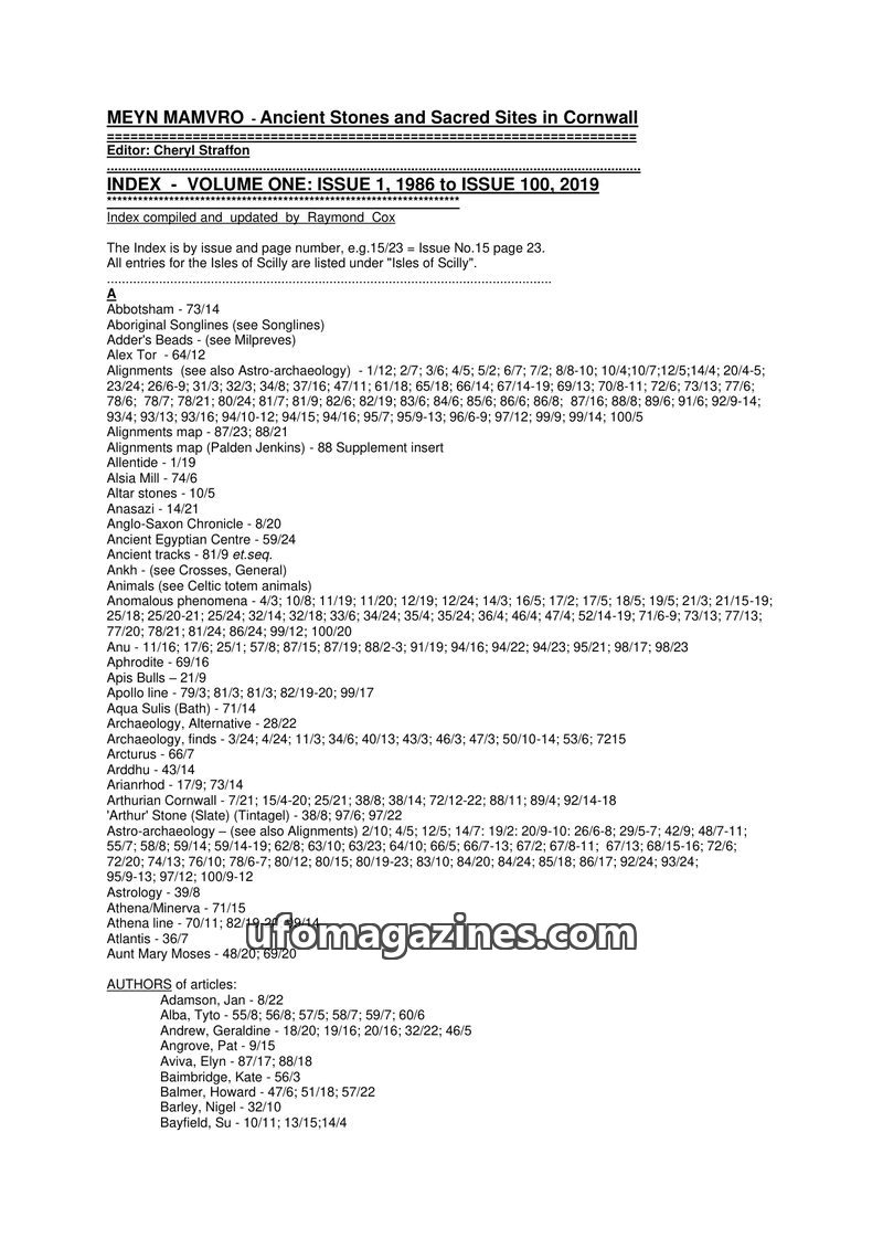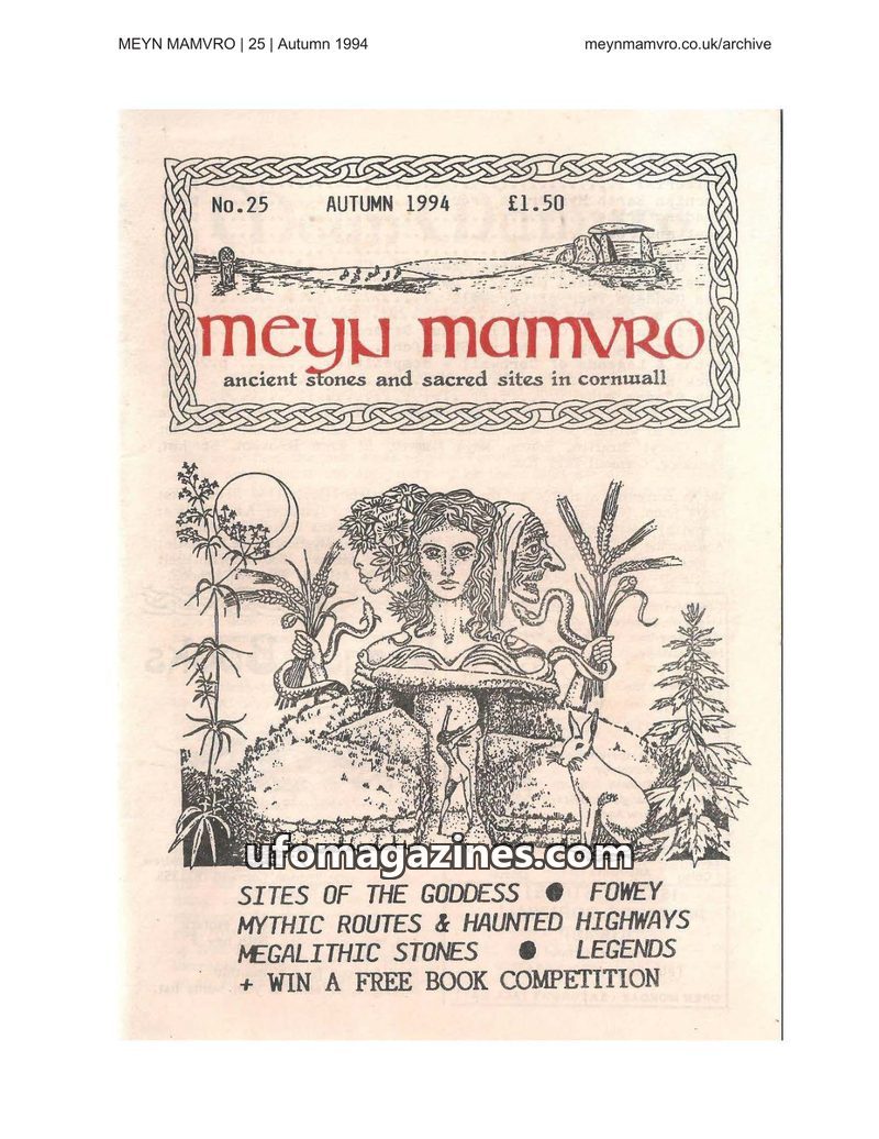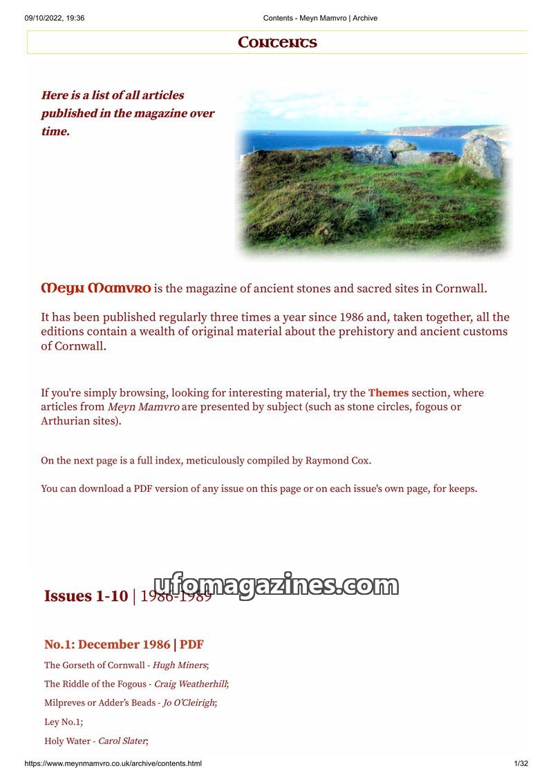 Meyn Mamvro is a magazine dedicated to ancient stones and sacred sites in Cornwall, published three times a year since 1986. The archive lists articles from issues 1-34, covering t