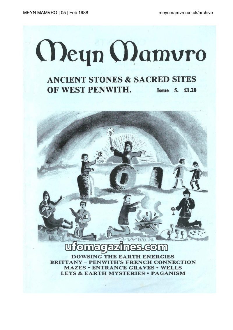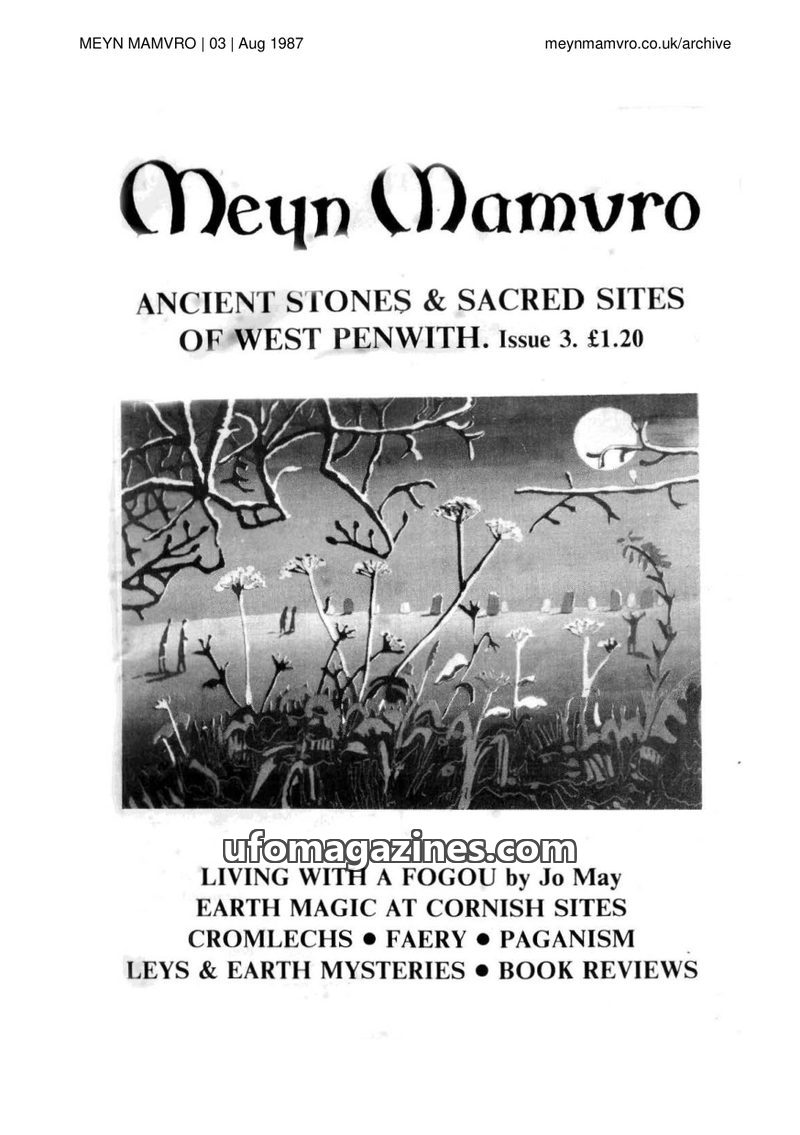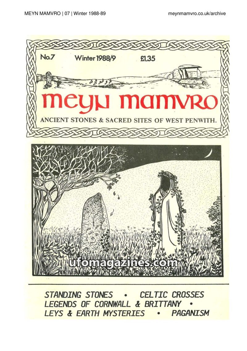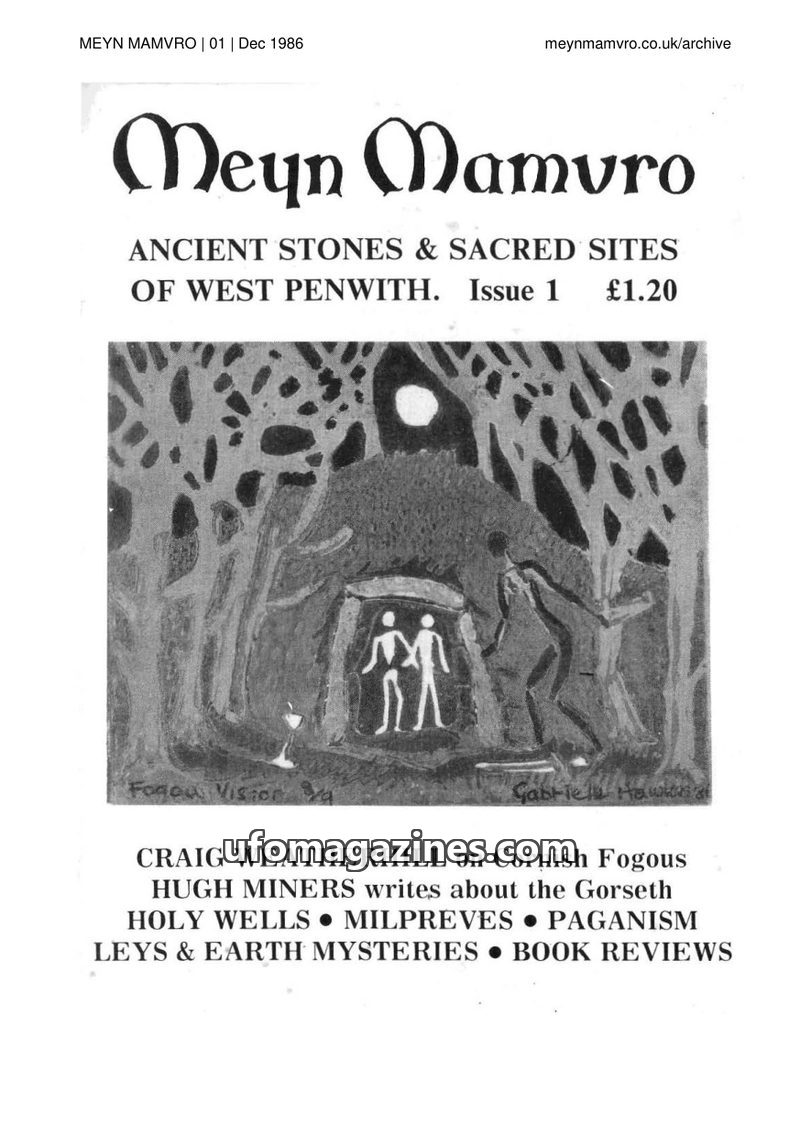 The first issue of Meyn Mamvro, published in December 1986, focuses on ancient stones and sacred sites in West Penwith, Cornwall. It aims to be a forum for writers, artists, and en