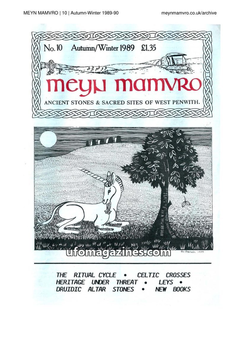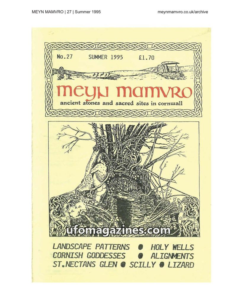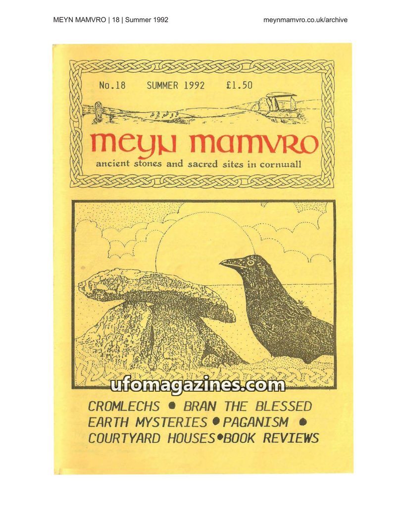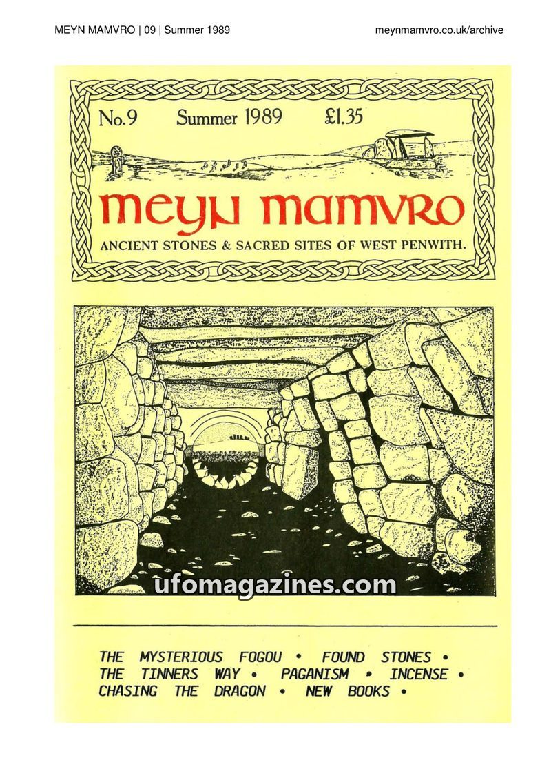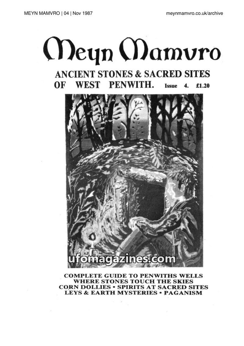 The first issue of Meyn Mamvro, published in December 1986, focuses on ancient stones and sacred sites in West Penwith, Cornwall. It aims to be a forum for writers, artists, and en