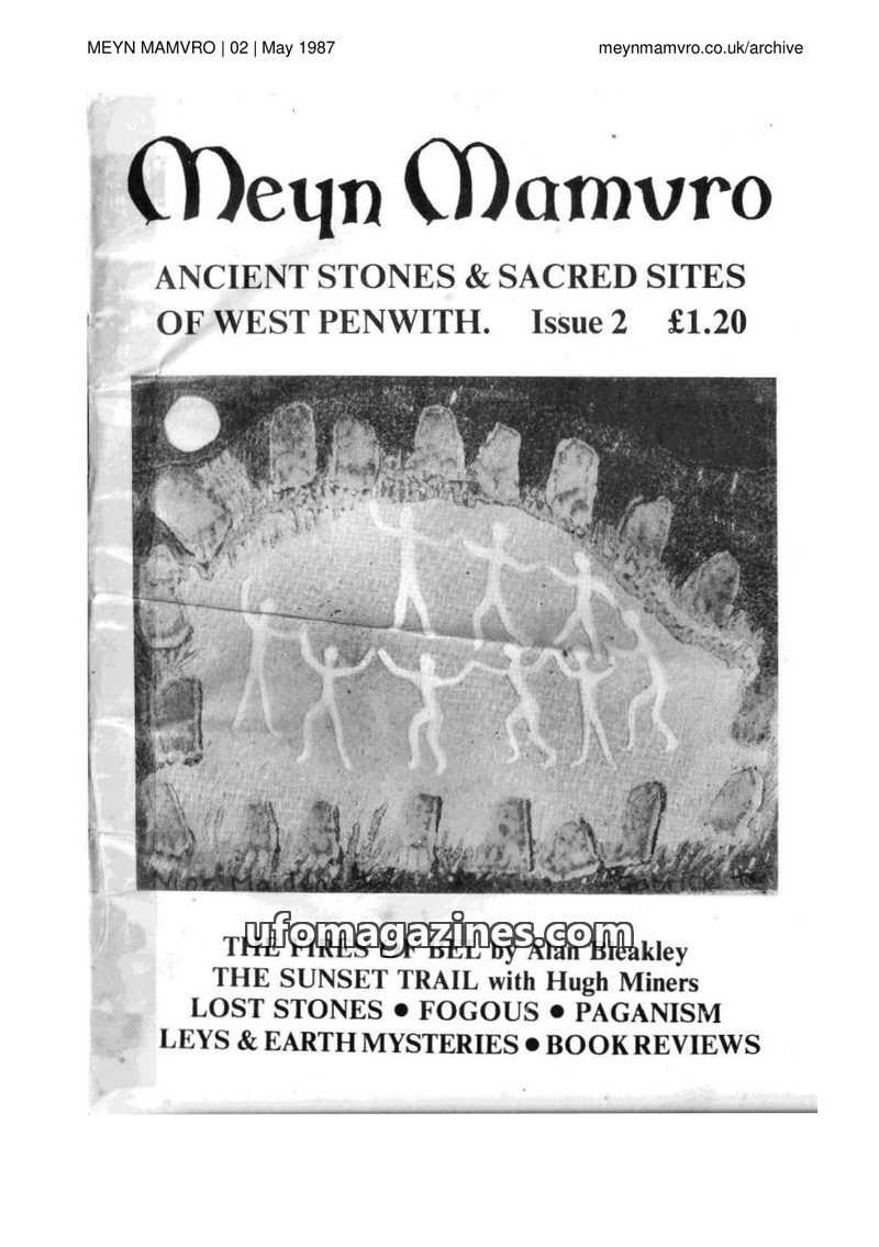 This issue of Meyn Mamvro, dated May 1987, focuses on ancient stones and sacred sites in West Penwith. It includes articles on the lost stones of Tregeseal Common, the spirit of Ca