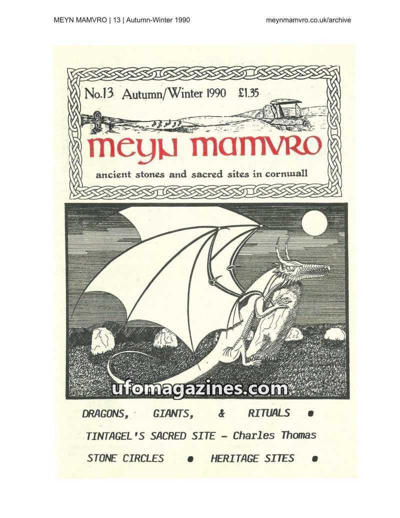 This issue of Meyn Mamvro (No. 13, Autumn/Winter 1990) focuses on ancient stones and sacred sites in Cornwall. Articles cover topics such as guardians of Cornwall's heritage, lost