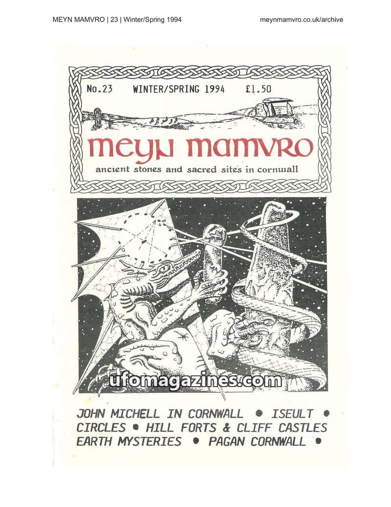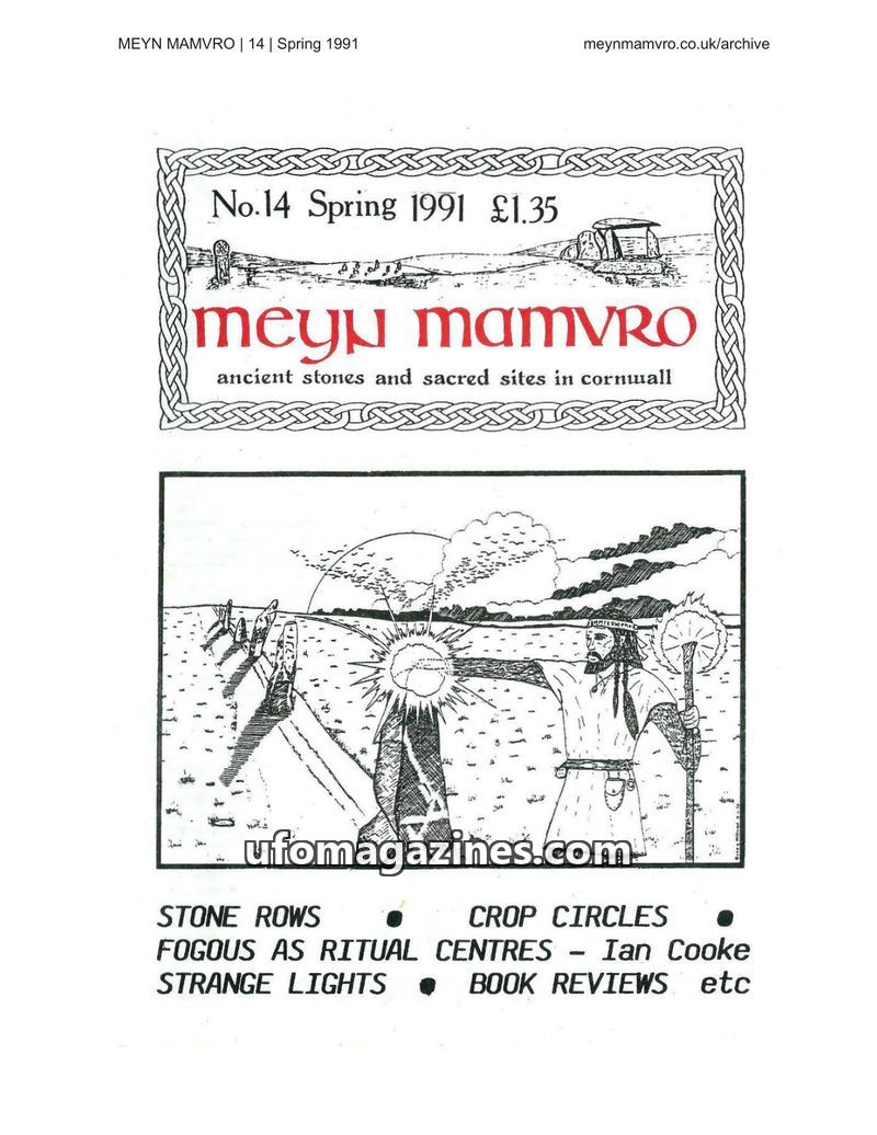 This issue of Meyn Mamvro focuses on ancient stones and sacred sites in Cornwall. It covers the emergence of crop circles in the region, the ritualistic function of Cornish fogous,