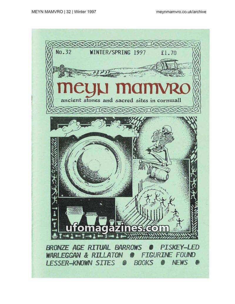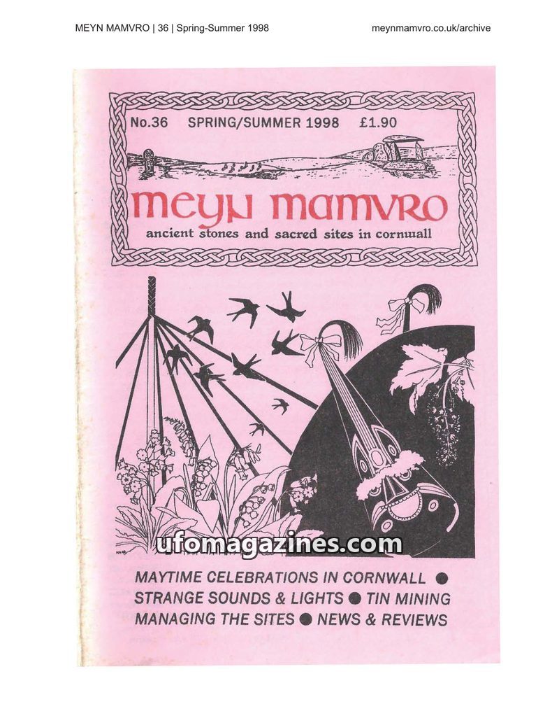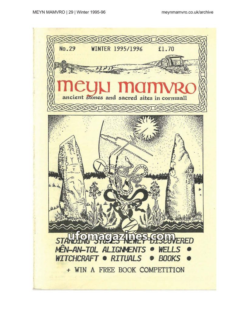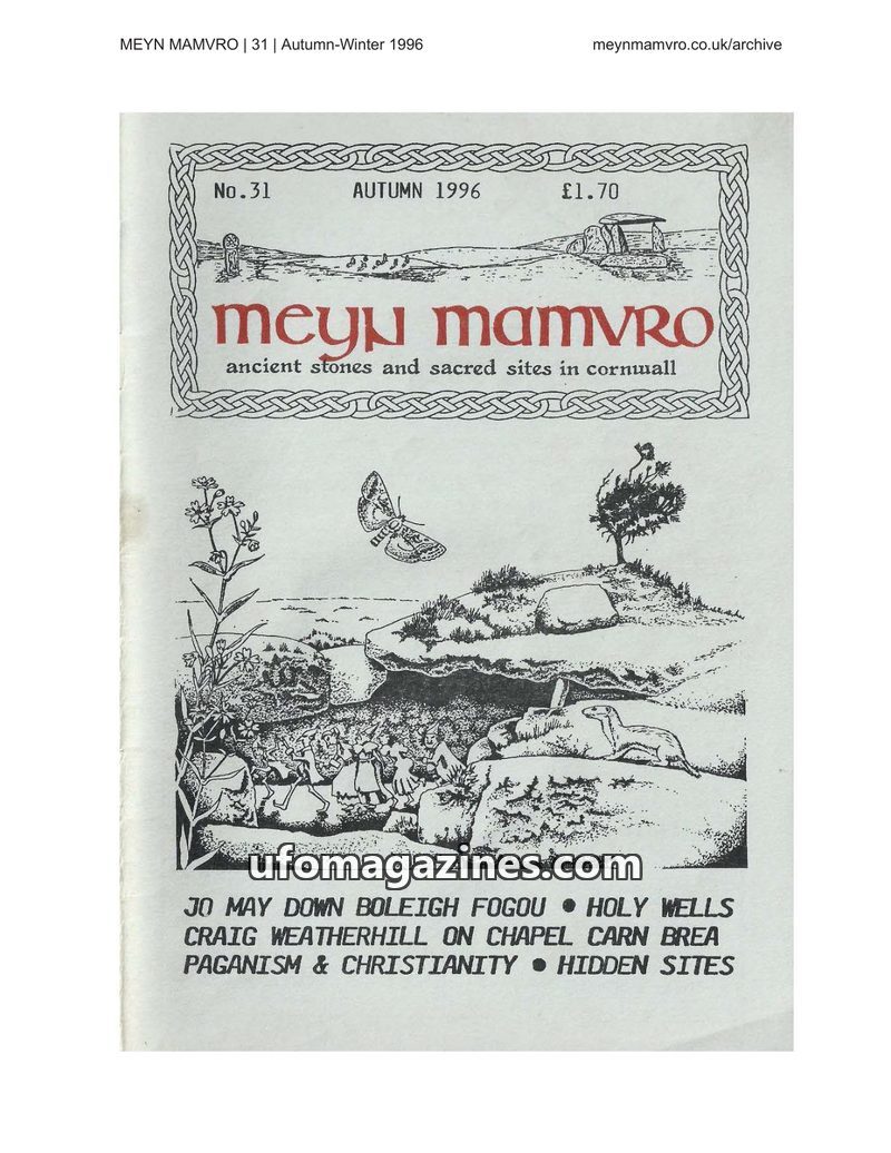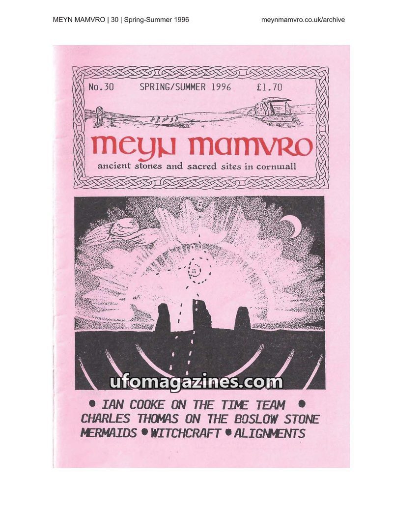 This issue of Meyn Mamvro (No. 30, Spring-Summer 1996) focuses on Cornish ancient sites and earth mysteries. It reviews Channel 4's 'Time Team' investigation of Boleigh fogou, crit