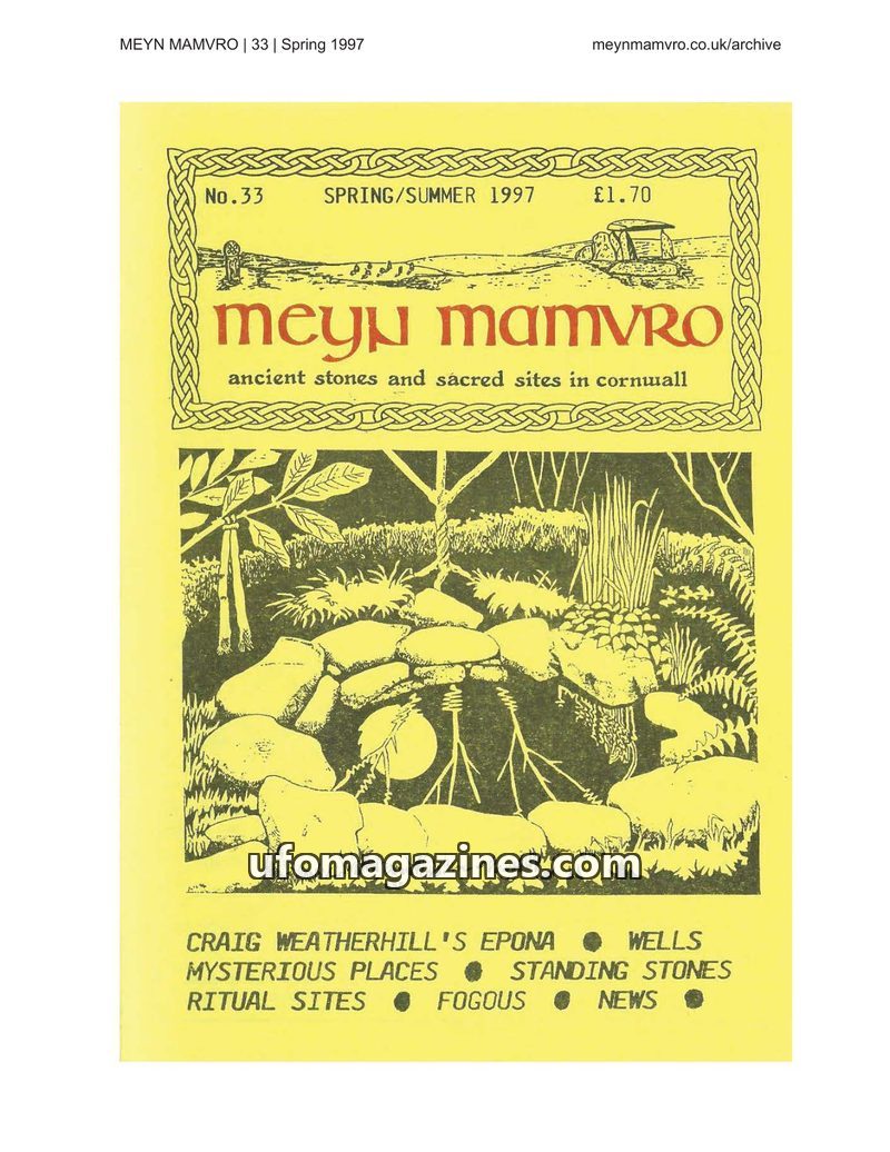 This issue of Meyn Mamvro focuses on ancient stones and sacred sites in West Penwith, Cornwall. It includes articles on Cornish holy wells, their healing and divination properties,