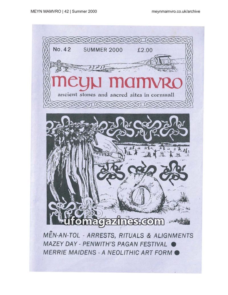 This issue of Meyn Mamvro (Summer 2000, No. 42) focuses on ancient stones and sacred sites in Cornwall. It details the arrest and sentencing of individuals responsible for a 'napal