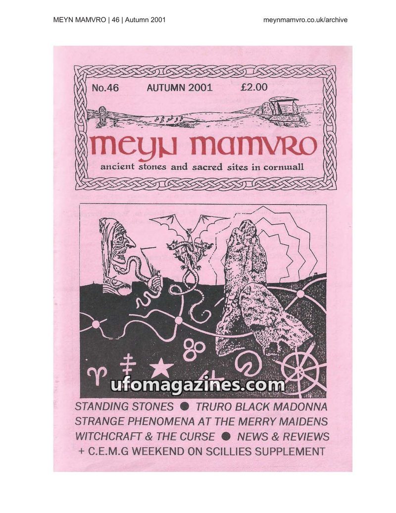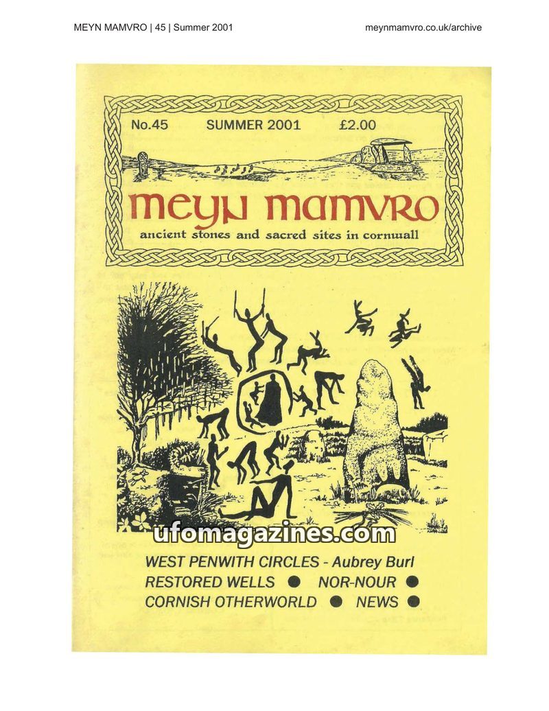 The Autumn 2001 issue of Meyn Mamvro focuses on Cornish Earth Mysteries, covering topics such as sacred sites, pagan practices, and folklore. It reports on recent restoration effor