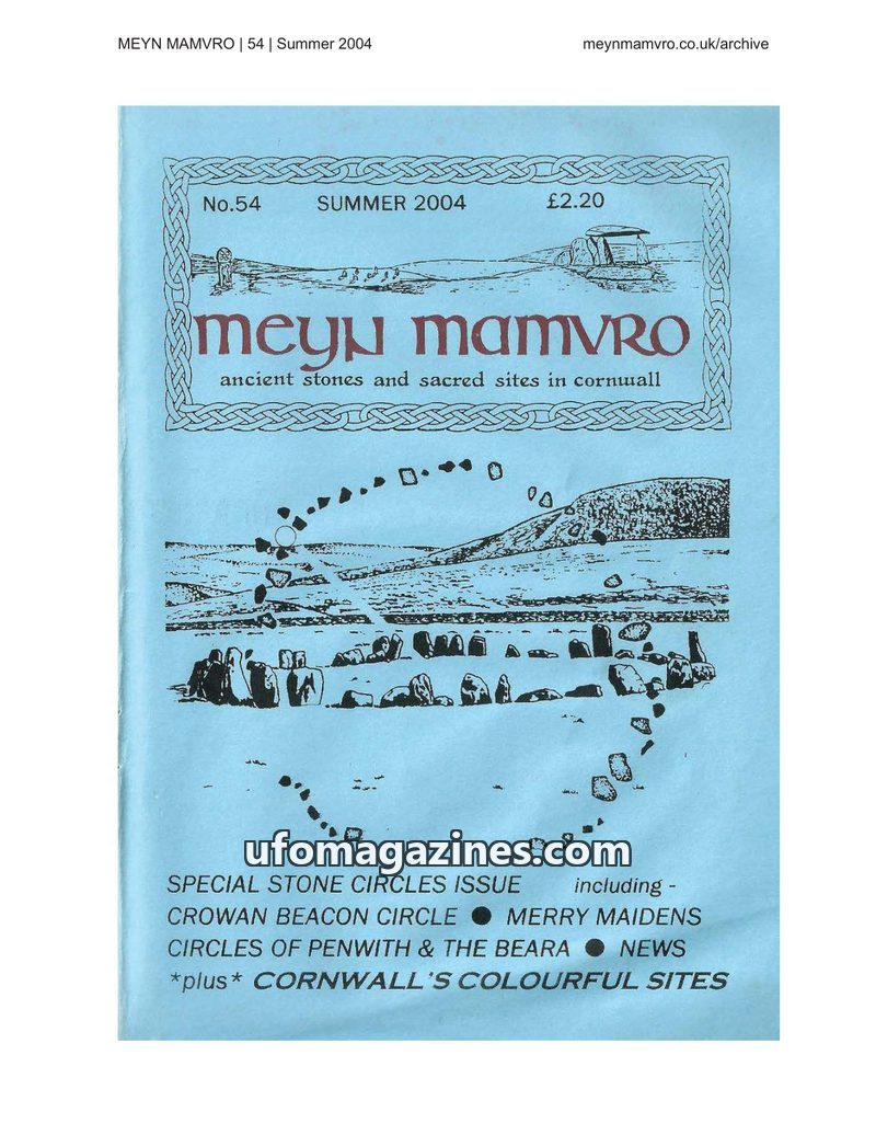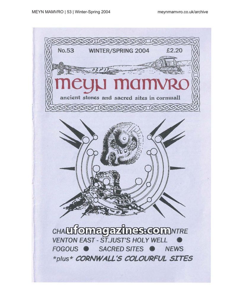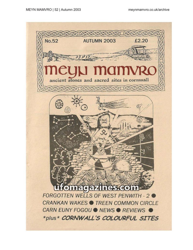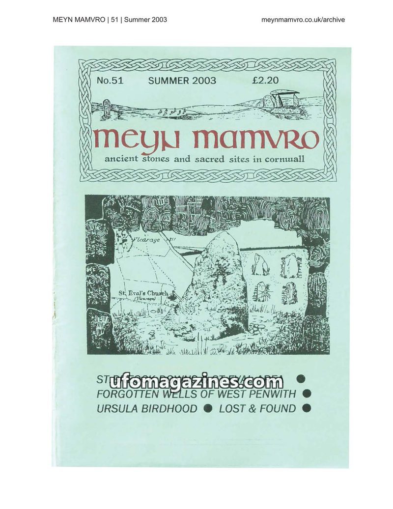 This issue of Meyn Mamvro (No. 51, Summer 2003) focuses on Cornwall's ancient stones and sacred sites. It includes articles on the St. Breock Downs and St. Eval area, forgotten wel