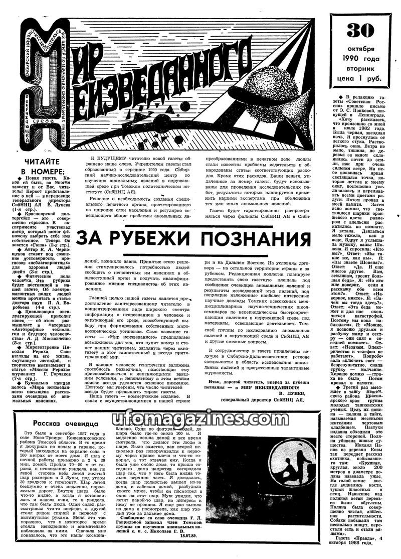 This issue of 'Mir neizvedannogo' (World of the Unknown) from October 30, 1990, delves into anomalous phenomena and the future of humanity. It features numerous eyewitness accounts