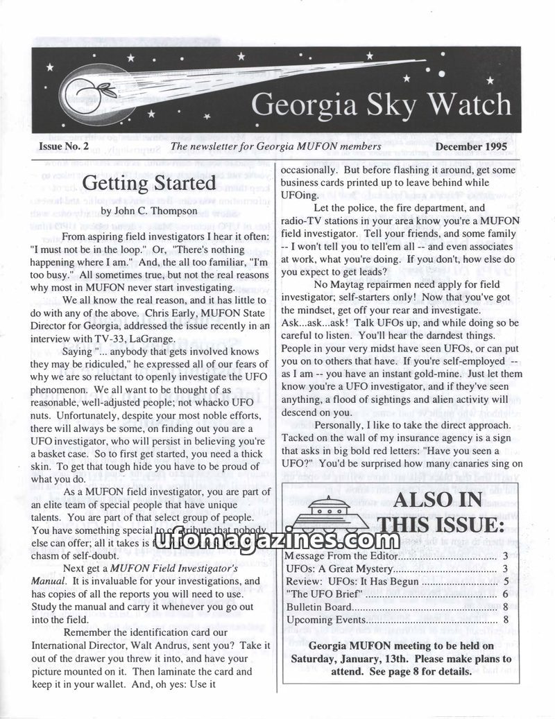 This issue of Georgia Sky Watch focuses on encouraging new UFO field investigators, emphasizing the need for a thick skin and proactive information gathering. It reviews the film '