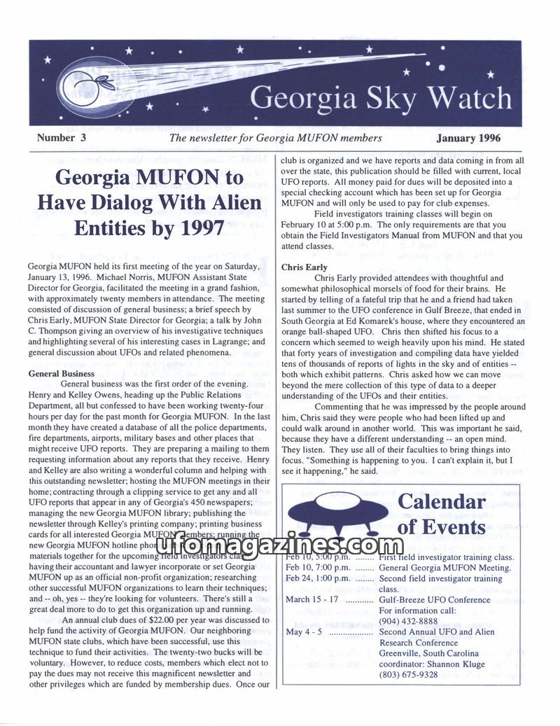 The January 1996 issue of Georgia Sky Watch covers the Georgia MUFON's upcoming plans, including a goal to dialog with alien entities by 1997 and field investigator training. It fe