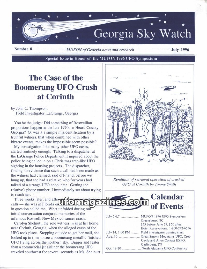 This issue of Georgia Sky Watch investigates the alleged 1970s Boomerang UFO crash at Corinth, Georgia, featuring witness testimony from Carolyn Shelnutt. The article explores pote