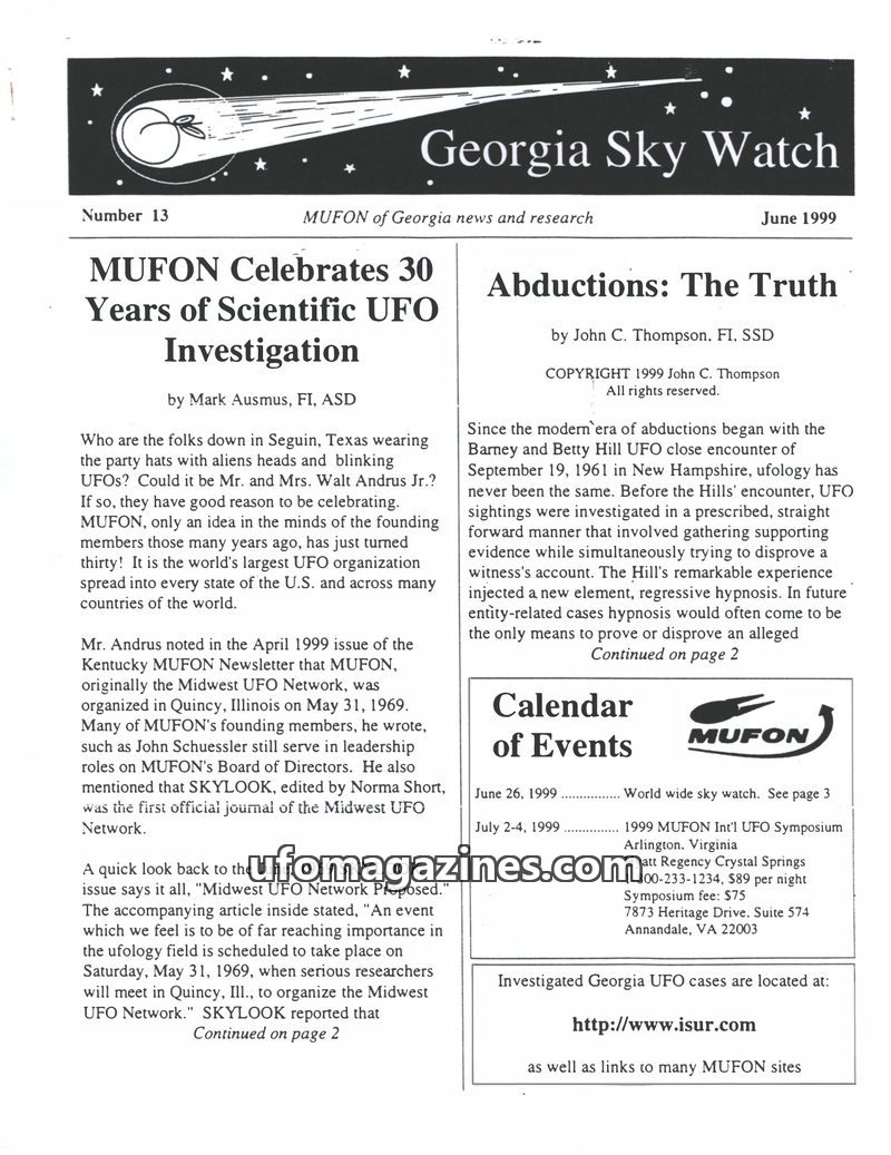 This issue of Georgia Sky Watch celebrates MUFON's 30th anniversary, tracing its origins as the Midwest UFO Network. It delves into the complex topic of alien abductions, contrasti