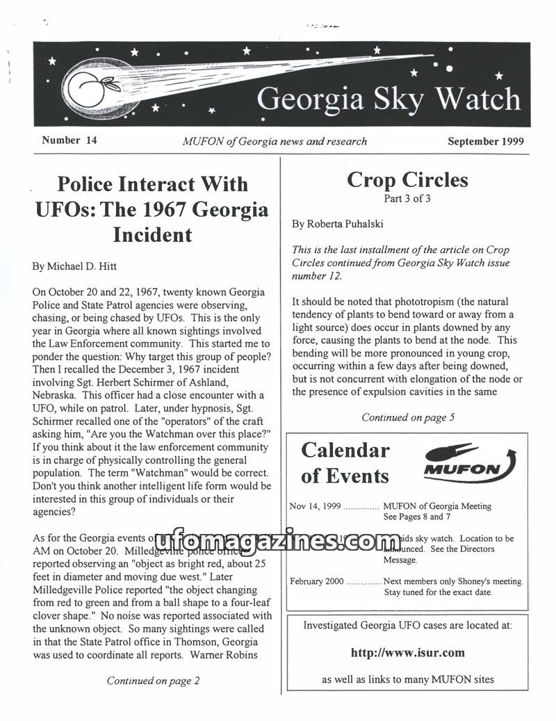 This issue of Georgia Sky Watch focuses on two main topics: the 1967 Georgia UFO Incident, where numerous law enforcement agencies reported sightings and encounters, and the ongoin
