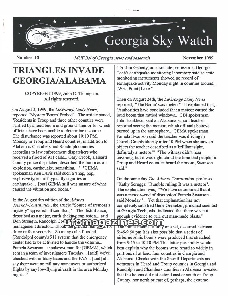 This issue details the mysterious 'sky booms' that occurred on August 2, 1999, across Georgia and Alabama. Initial reports suggested an earthquake or explosion, but investigations