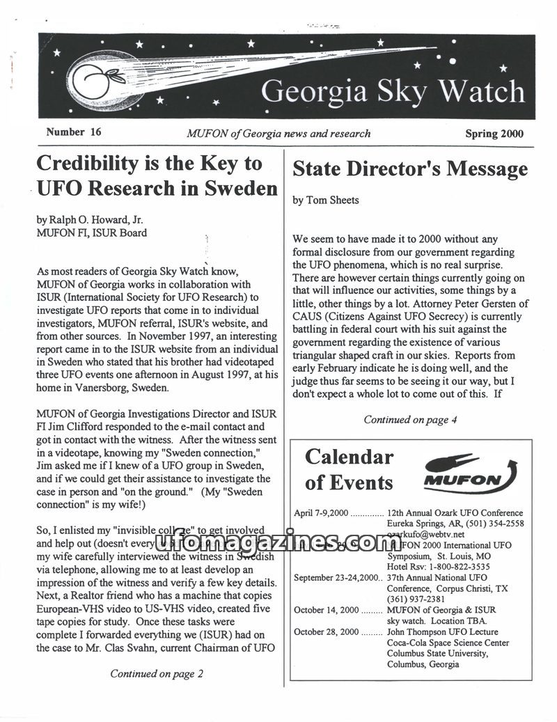 This issue of Georgia Sky Watch highlights the importance of credibility in UFO research, focusing on the work of UFO-Sweden, a Swedish organization with extensive archives and a r