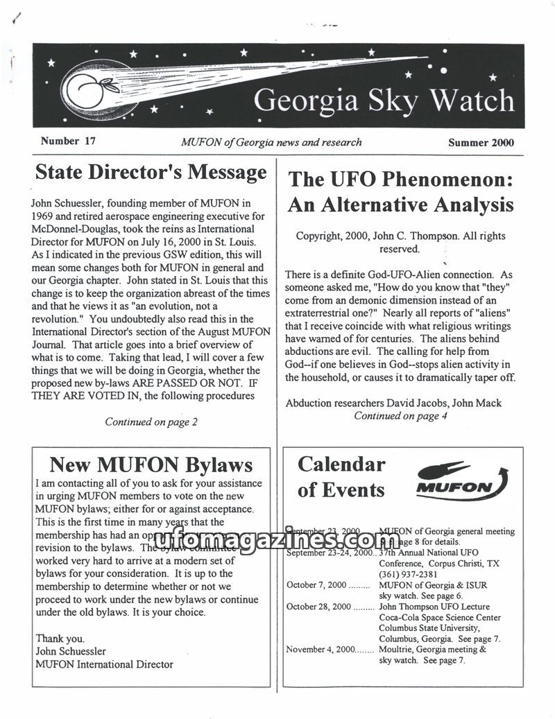 This issue of Georgia Sky Watch covers MUFON's organizational changes, including new bylaws and restructuring of state leadership. It features an analysis of the UFO phenomenon, ex