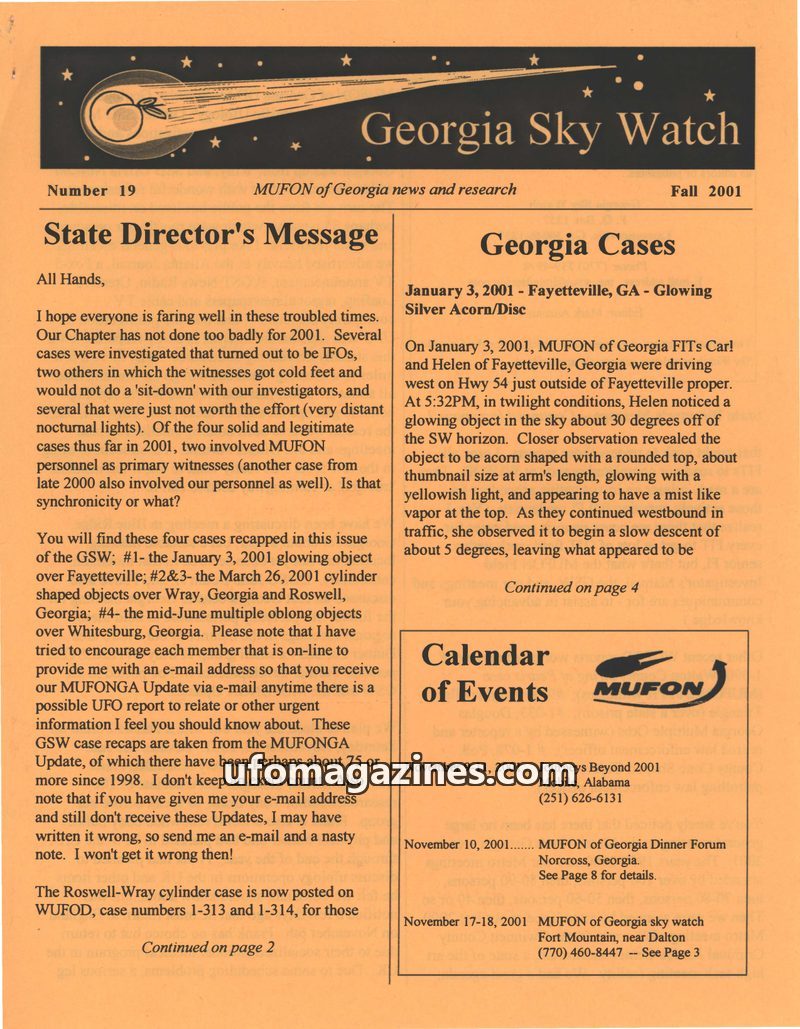 This issue of Georgia Sky Watch details several UFO investigations conducted by MUFON of Georgia in 2001, including sightings over Fayetteville, Wray, Roswell, and Whitesburg. It h
