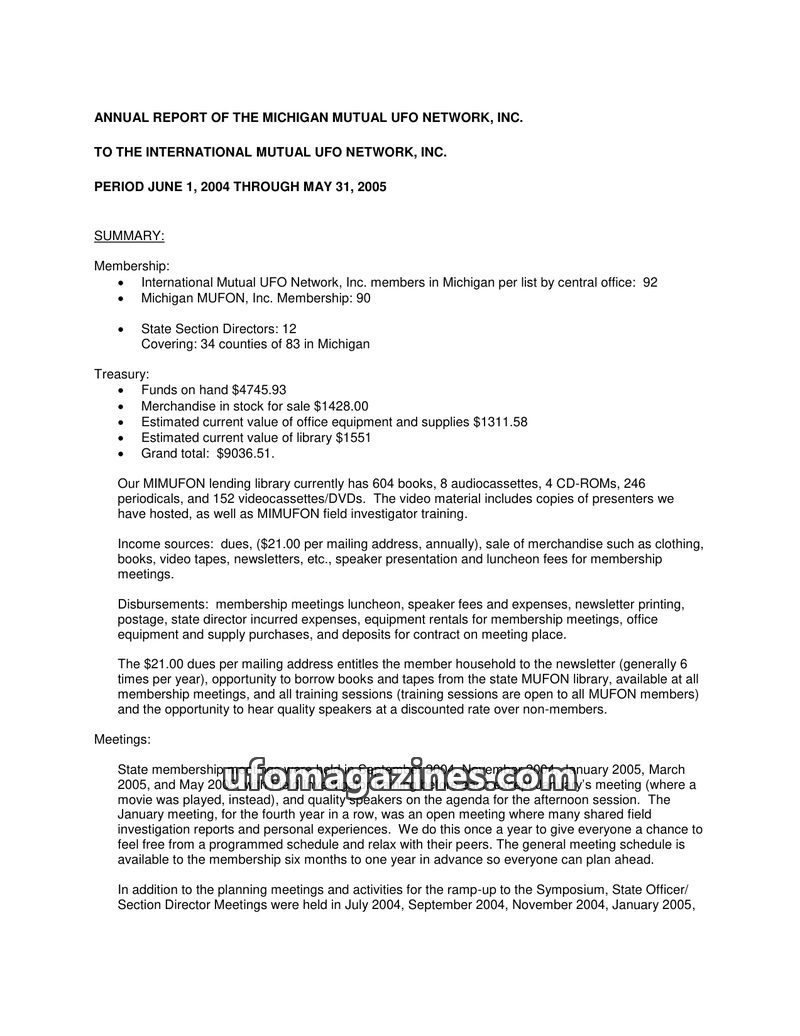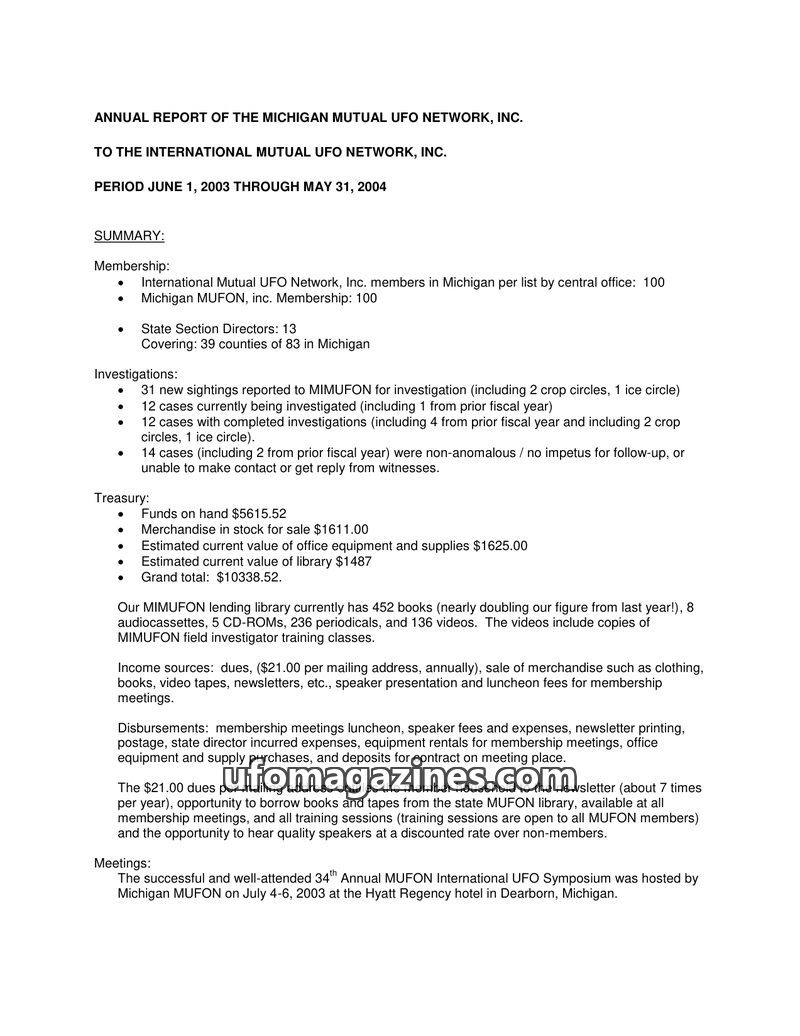 The Michigan Mutual UFO Network, Inc. (MIMUFON) reported on its activities from June 1, 2003, to May 31, 2004. The organization had 100 members and covered 39 counties. They invest