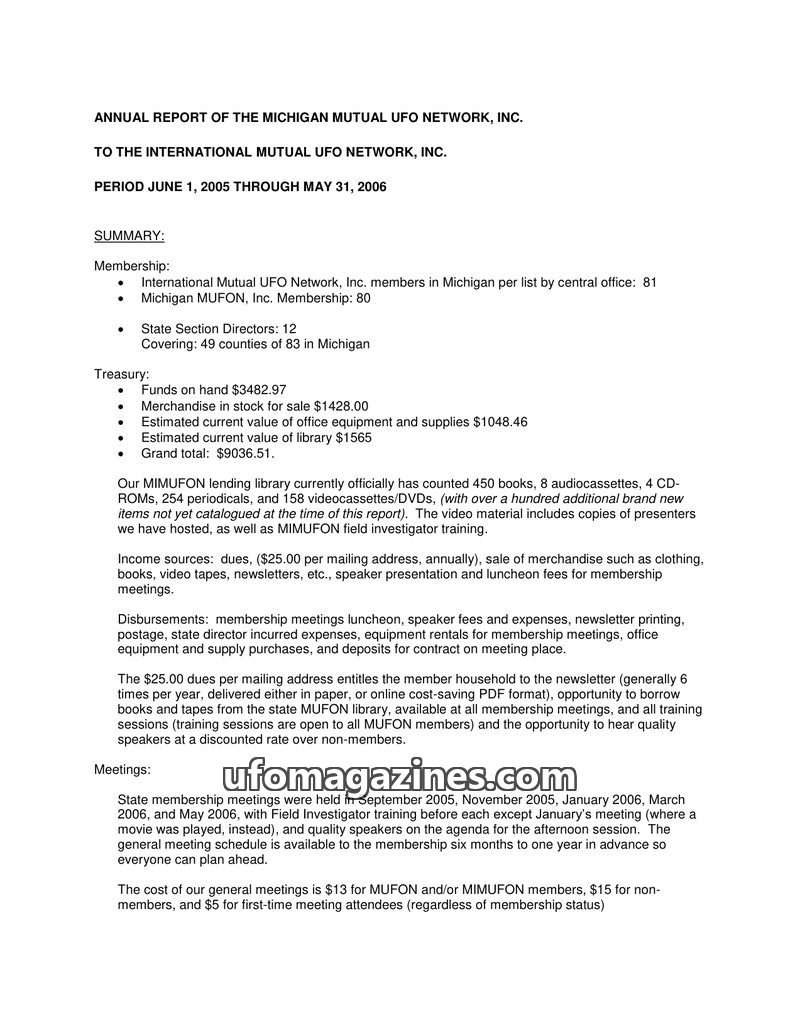 The Michigan Mutual UFO Network, Inc. (MIMUFON) annual report for 2005-2006 highlights a membership of 80 individuals and 12 State Section Directors covering 49 counties. The organ