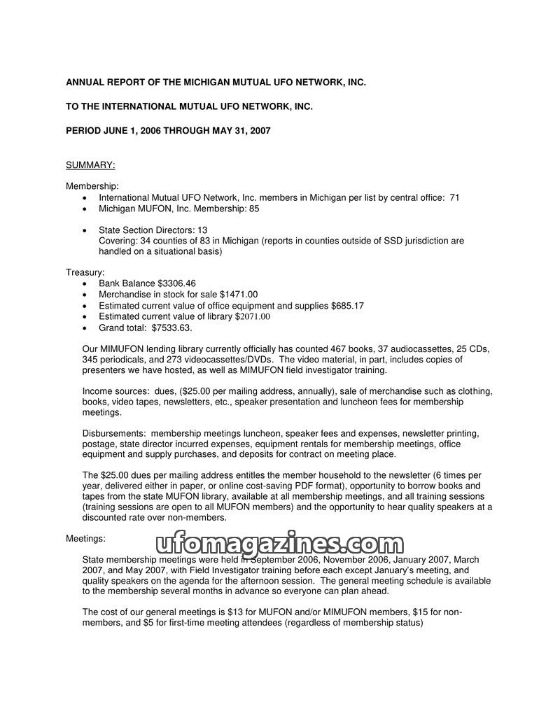 The Michigan Mutual UFO Network, Inc. (MUFON) annual report for the period June 1, 2006, to May 31, 2007, highlights a membership of 85 individuals and 13 State Section Directors c