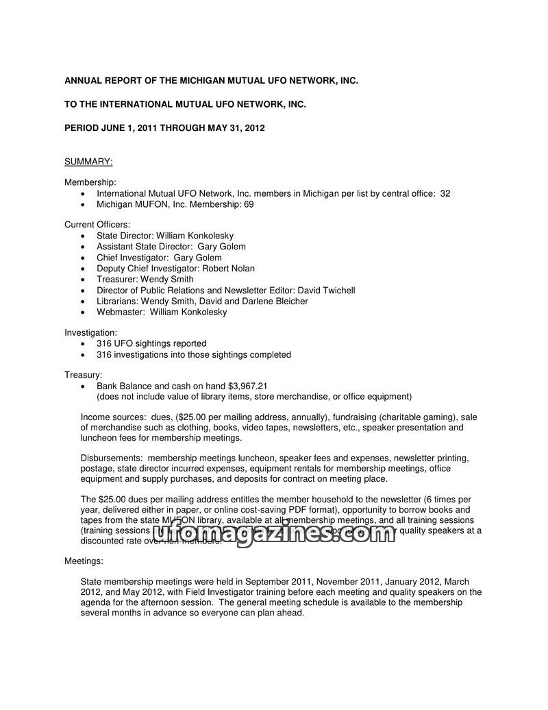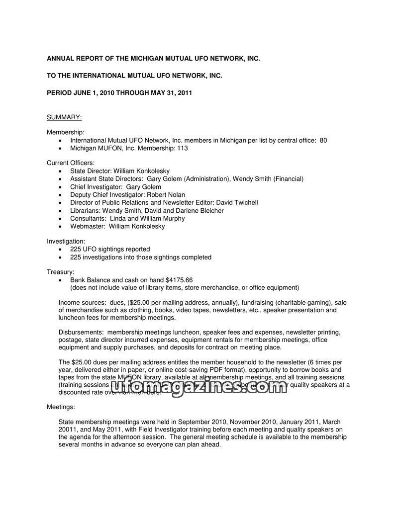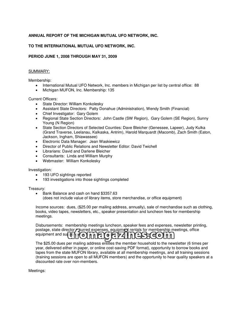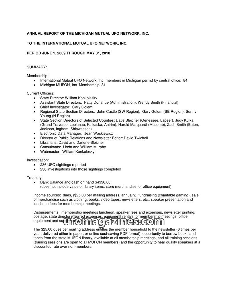 The Michigan MUFON's annual report for 2009-2010 details a membership of 81, with 236 UFO sightings reported and investigated. The organization maintained its 501(c)(3) status, hel