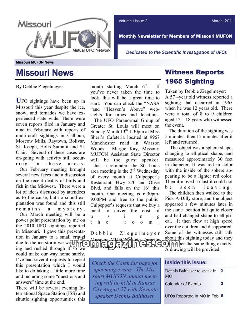 The March 2011 issue of Missouri MUFON News reports an increase in UFO sightings in Missouri during the preceding months. It details specific witness accounts from 1965 and 2005, a