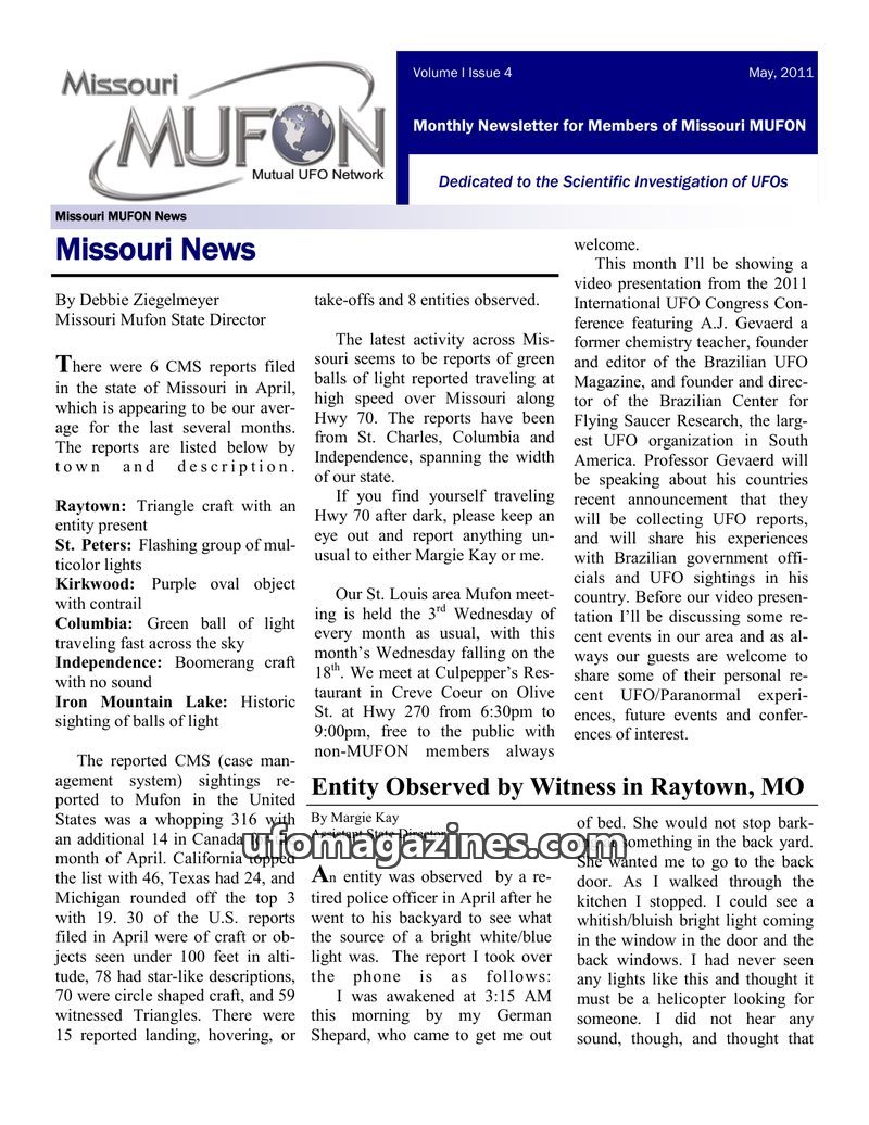 The May 2011 Missouri MUFON Newsletter reports on 6 UFO sightings in Missouri for April, including a triangle craft with an entity in Raytown and green balls of light along Highway