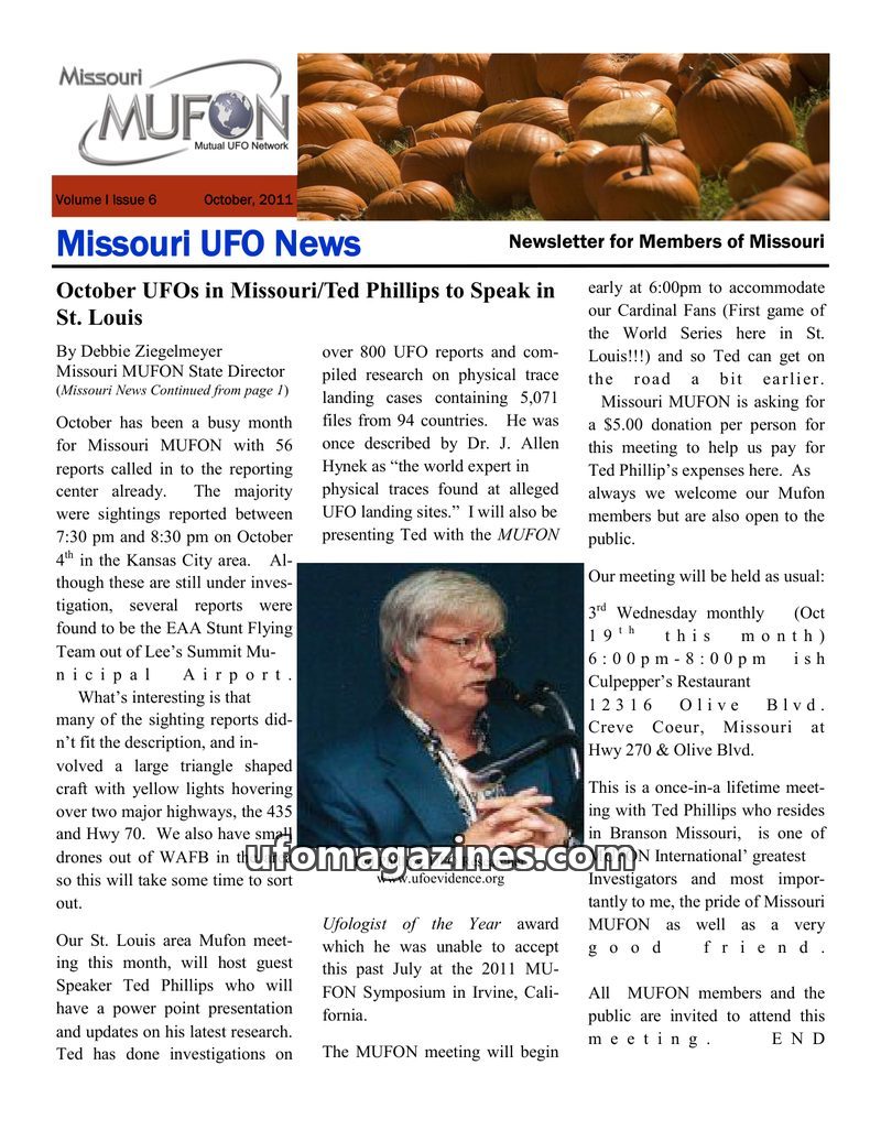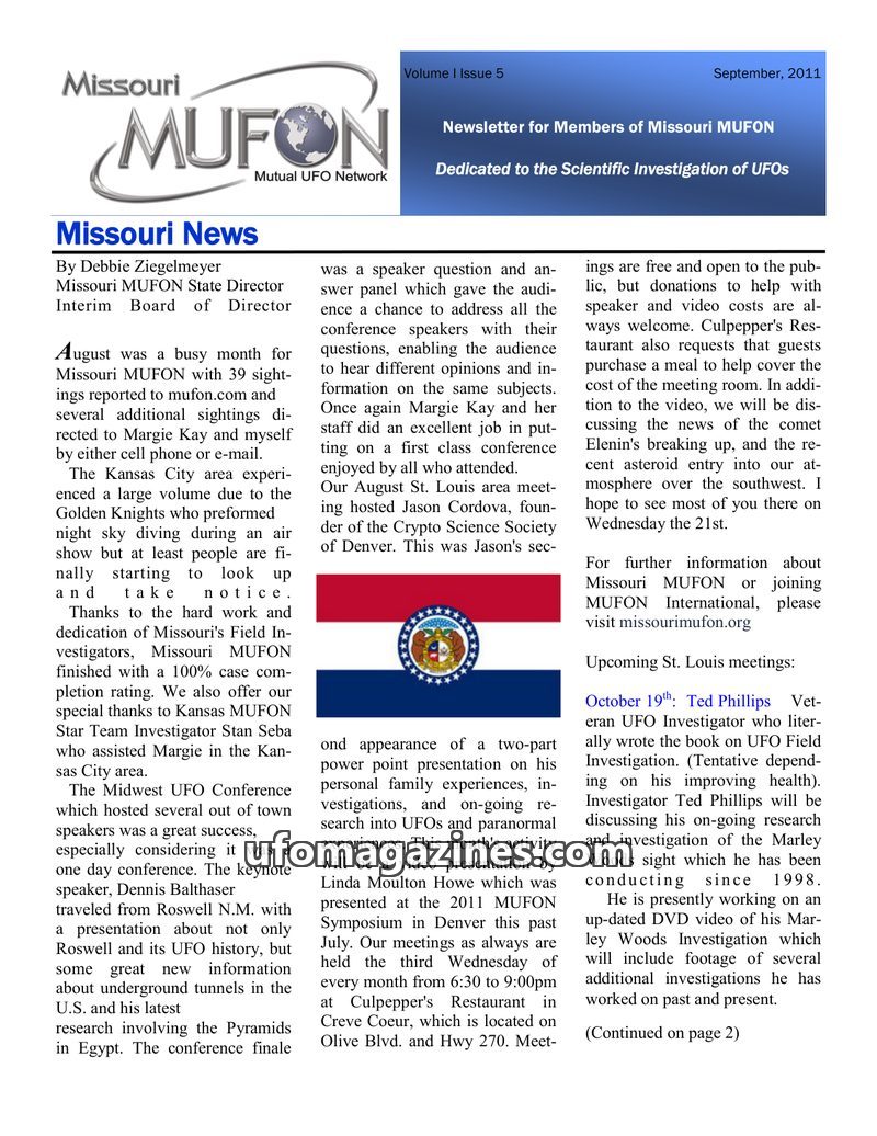 Missouri MUFON reported 39 UFO sightings in August 2011, with a significant increase in reports across many states. The Midwest UFO Conference was a success, featuring speakers lik