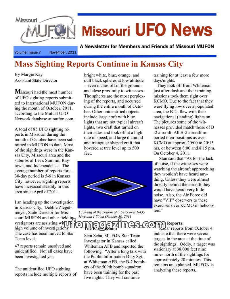 This issue of the Missouri MUFON Newsletter details numerous reports of unexplained aerial phenomena in Missouri during 2012. Sightings include strange balls of light, triangular c