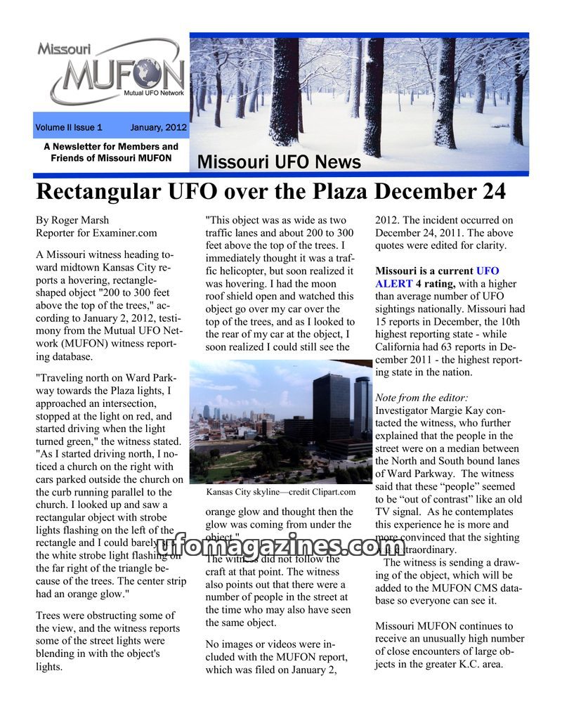 The January 2012 Missouri MUFON Newsletter highlights a sighting of a rectangular UFO over Kansas City on December 24, 2011, described as having strobe lights and an orange glow. T