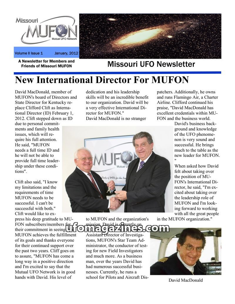 This issue of the Missouri MUFON Newsletter announces David MacDonald as the new International Director, replacing Clifford Clift. It details recent UFO sightings in Missouri, incl