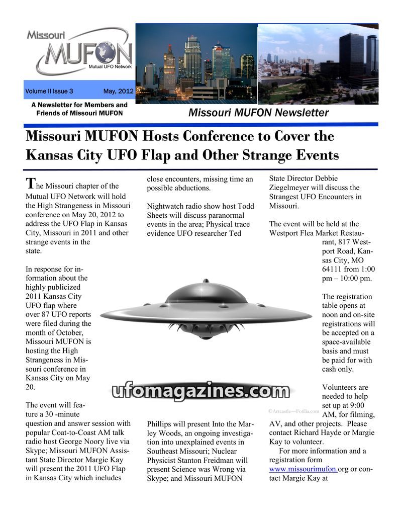 The May 2012 Missouri MUFON Newsletter announces a conference on the Kansas City UFO Flap and other strange events in Missouri, held on May 20, 2012. The event features speakers li