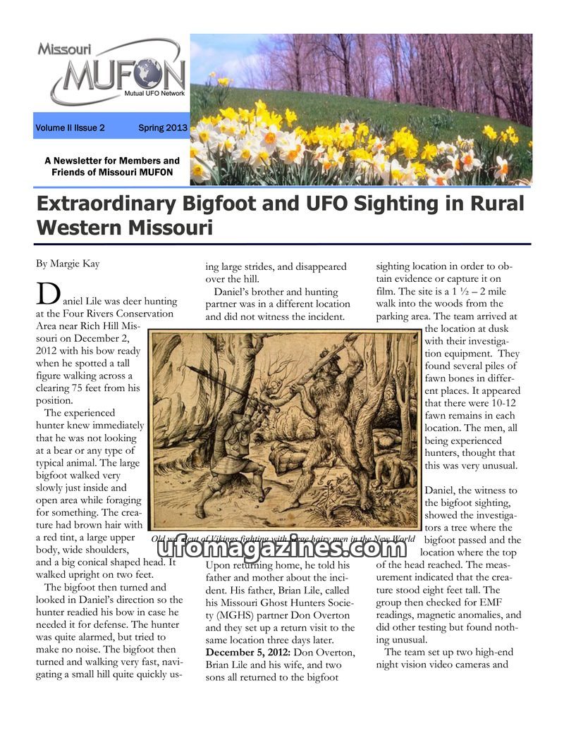This issue of the Missouri MUFON Newsletter details an extraordinary Bigfoot and UFO sighting in rural Western Missouri on December 2, 2012, where witness Daniel Lile observed a ta