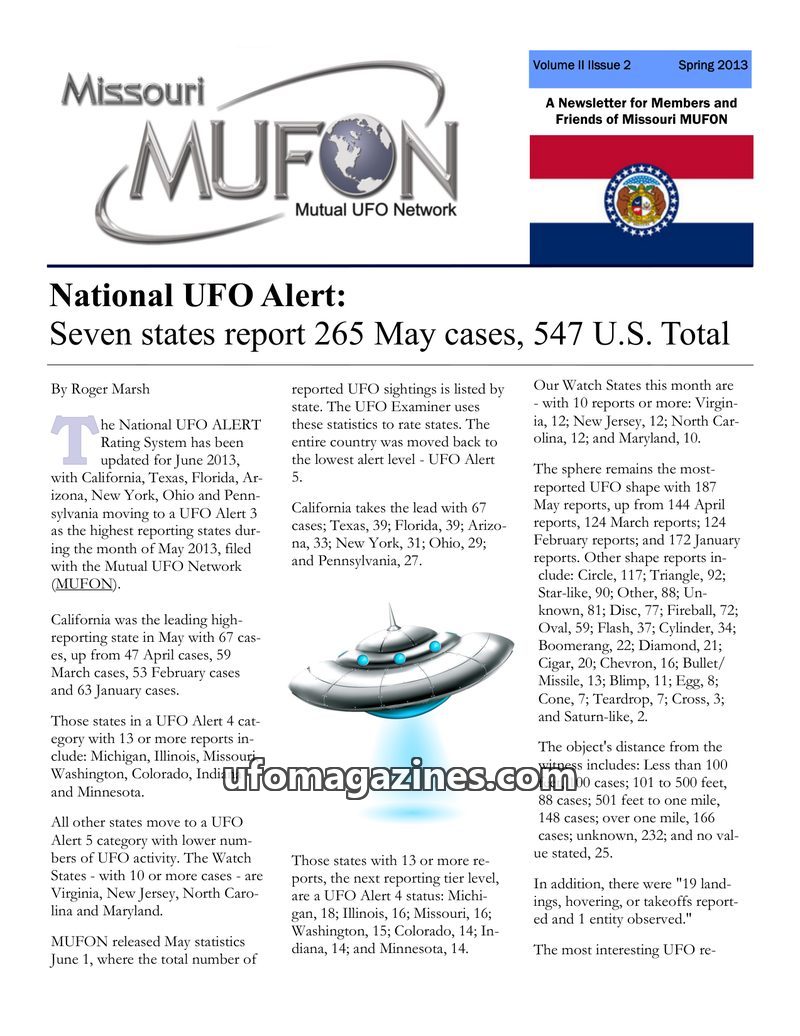 The Missouri MUFON Newsletter for Spring 2013 reports on national UFO sighting statistics, with seven states reporting 265 cases in May 2013. It details the most common UFO shapes