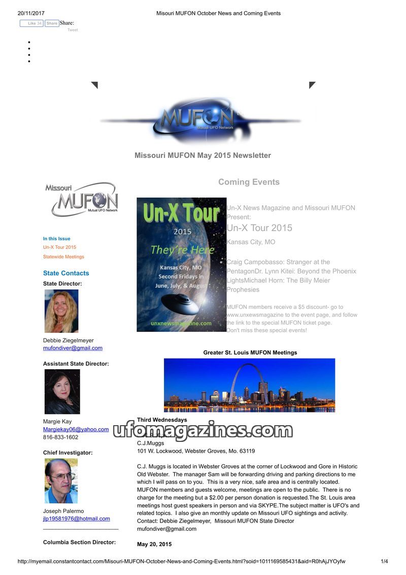 This Missouri MUFON newsletter from May 2015 highlights upcoming events like the Un-X Tour 2015 in Kansas City, featuring speakers on UFO topics. It details regular MUFON meetings
