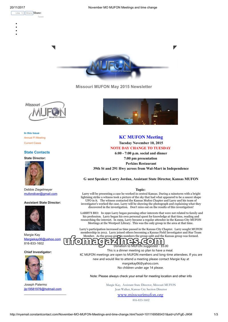 This newsletter from Missouri MUFON announces upcoming meetings for various chapters in November 2015. The KC MUFON meeting features Larry Jordan discussing a UFO case involving a