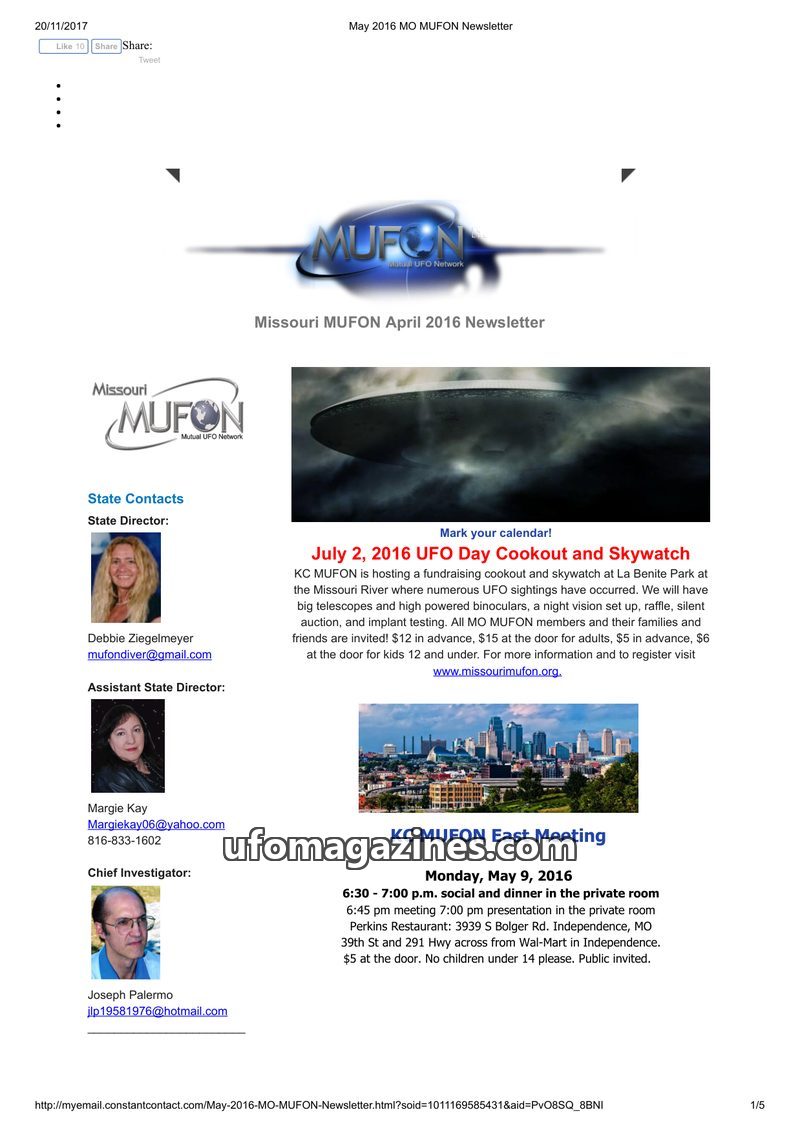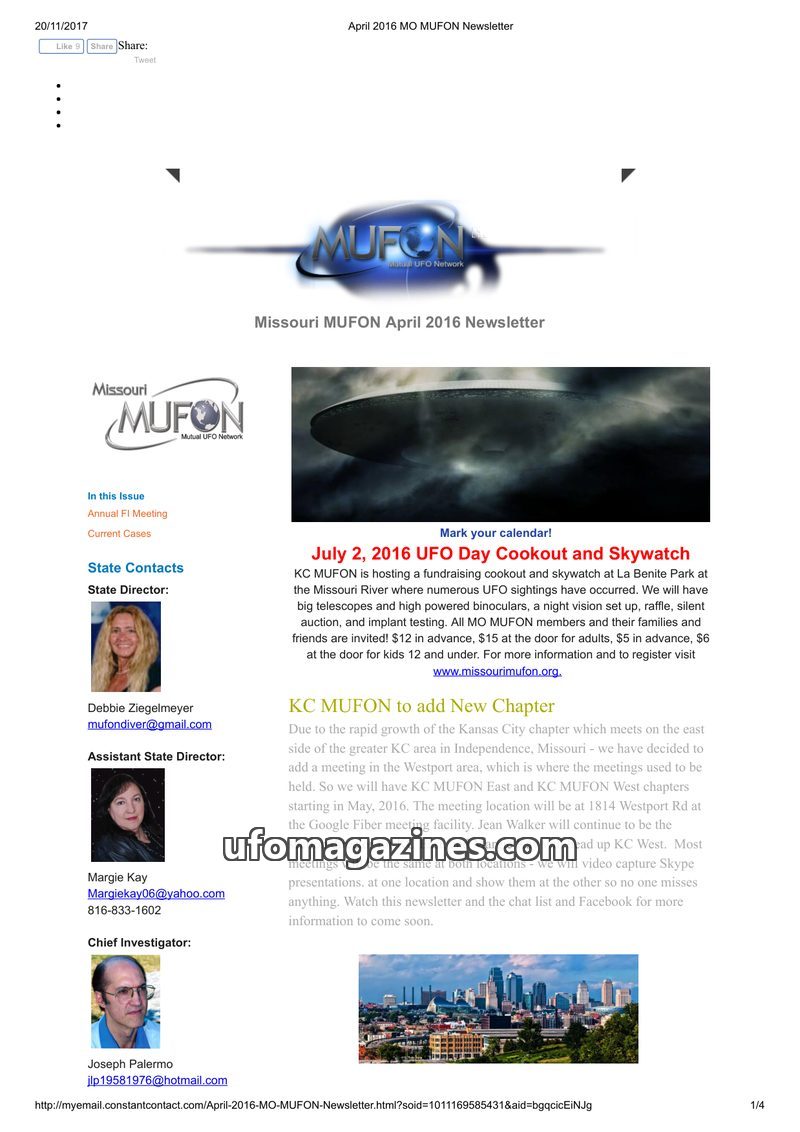 The April 2016 Missouri MUFON Newsletter announces upcoming events including a UFO Day Cookout and Skywatch on July 2, 2016, and the formation of new KC MUFON chapters (East and We