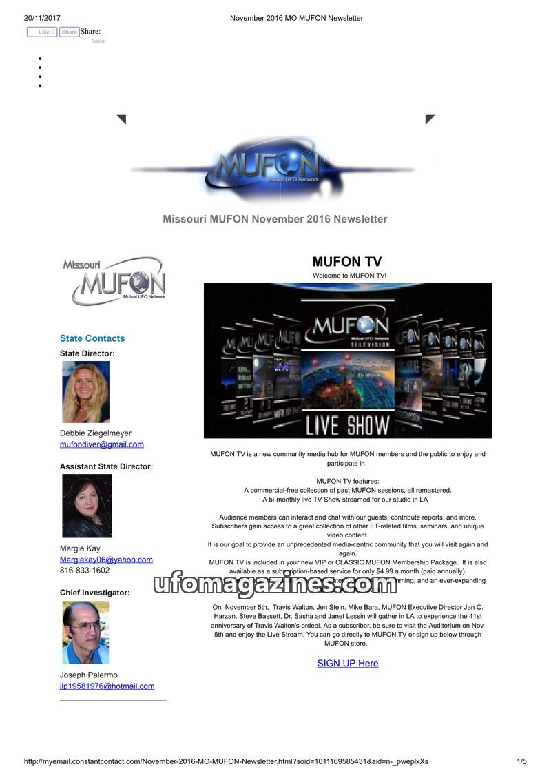 The November 2016 Missouri MUFON newsletter introduces MUFON TV, a new community media hub offering remastered sessions, live shows, and exclusive content for members. It highlight