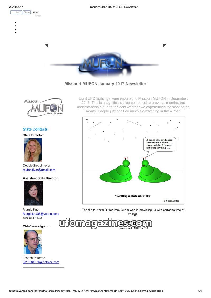 The Missouri MUFON newsletter for January 2017 details a decrease in UFO sightings for December 2016, attributed to cold weather. It introduces MUFON TV, a new media hub for member