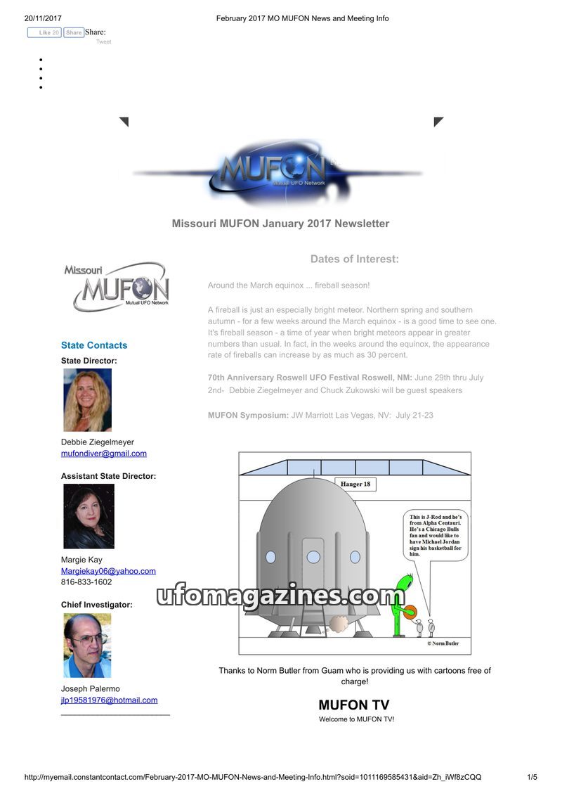 The Missouri MUFON newsletter for January 2017 highlights 'fireball season' as a period of increased meteor activity. It announces upcoming events including the 70th Anniversary Ro