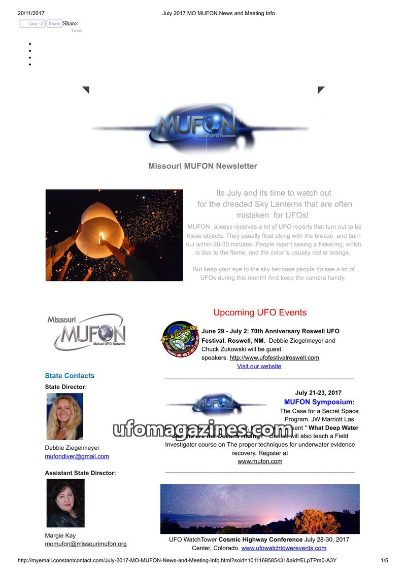 The July 2017 Missouri MUFON Newsletter highlights upcoming UFO events including the Roswell UFO Festival and MUFON Symposium. It provides contact information for state directors a